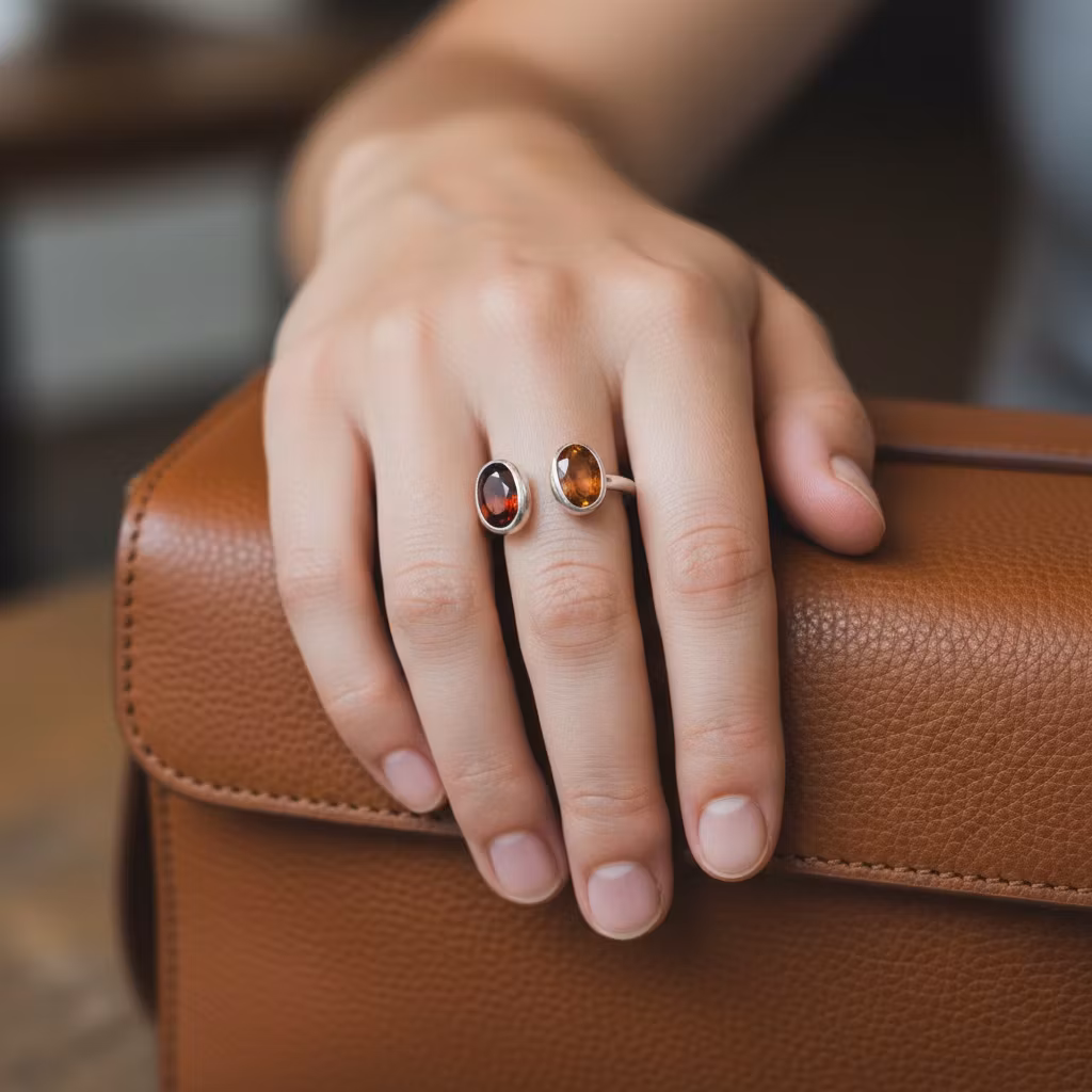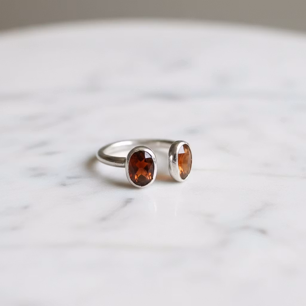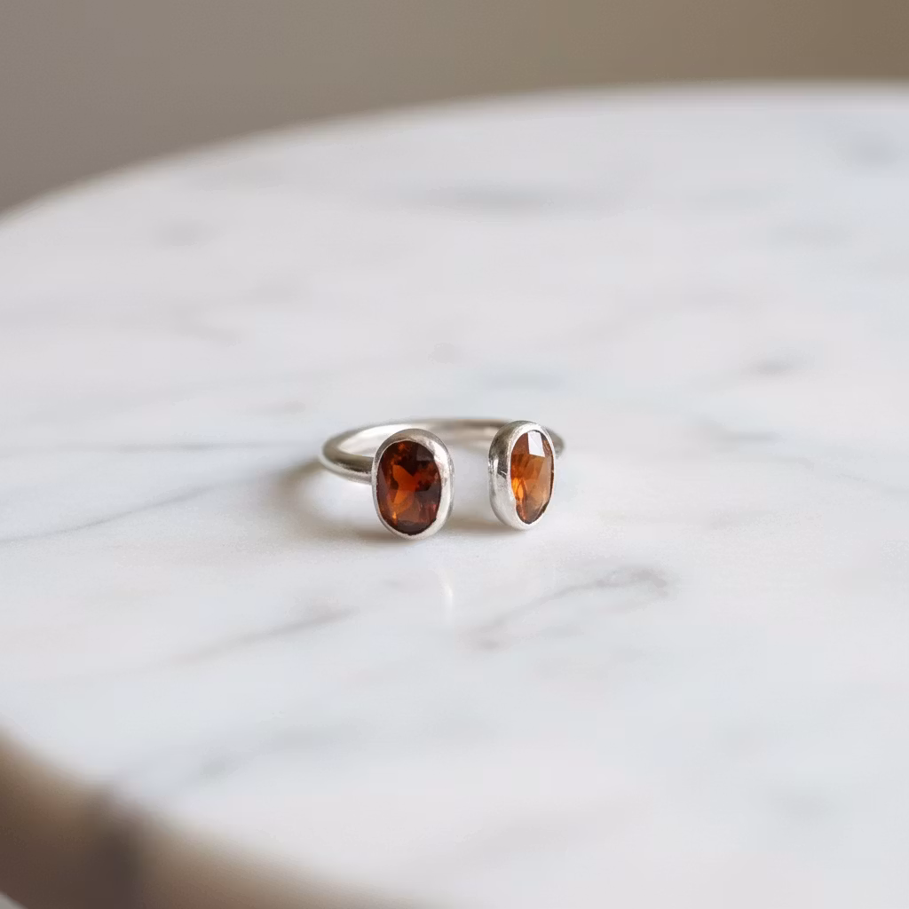 Öppen justerbar silverring i äkta silver med orange fasettslipade hessonit granat stenar. Ringen har en slät och skinande blank silveryta med 7mm ovala hessoniter. Ringen är tillverkad i sterling silver och är lite ställbar i storleken. Elegant silver ring med orangea granater. Polerduk medföljer.