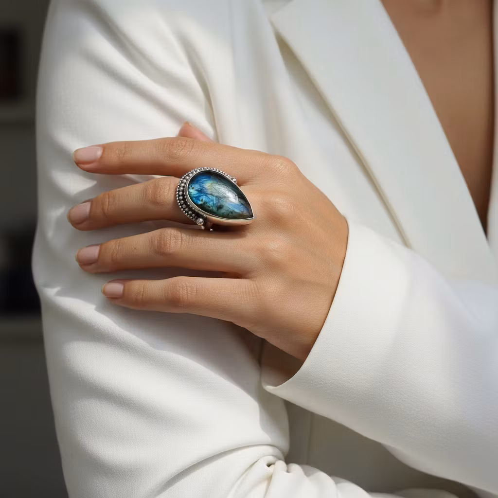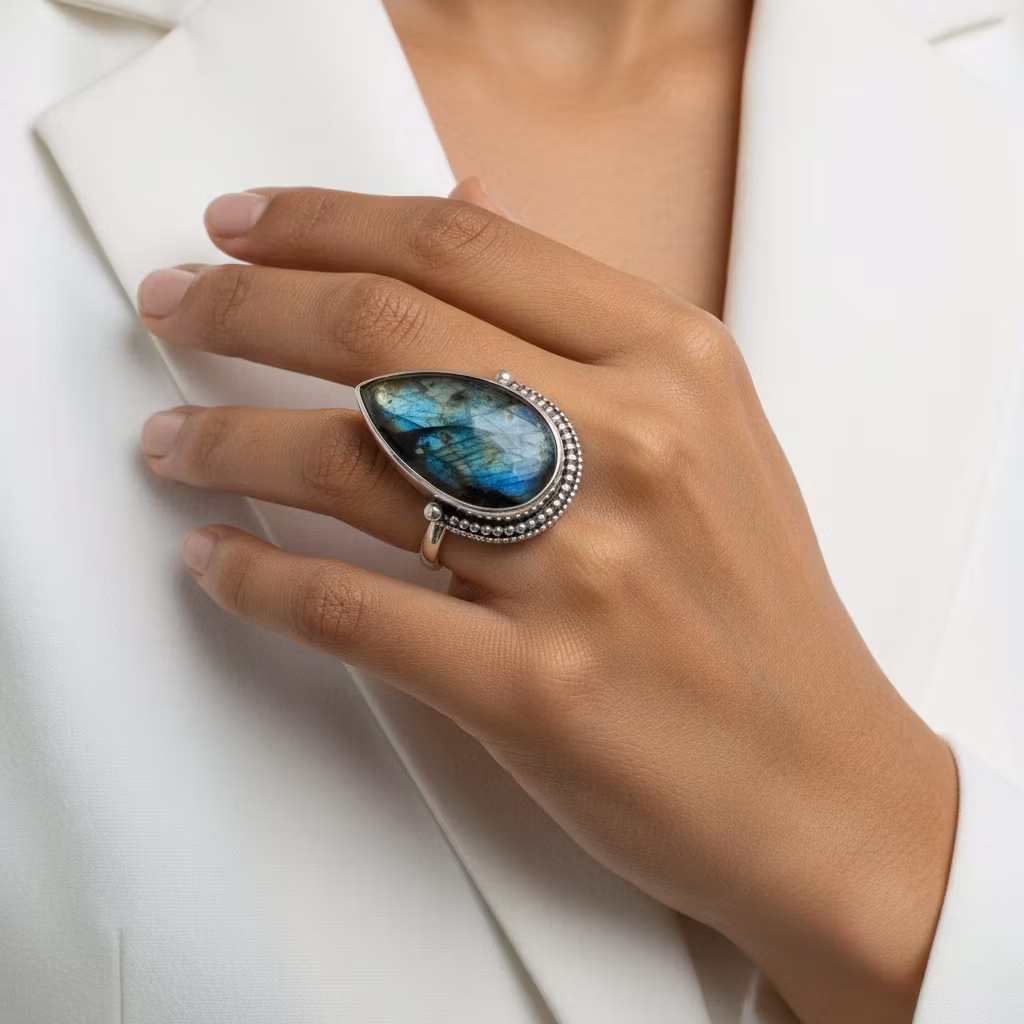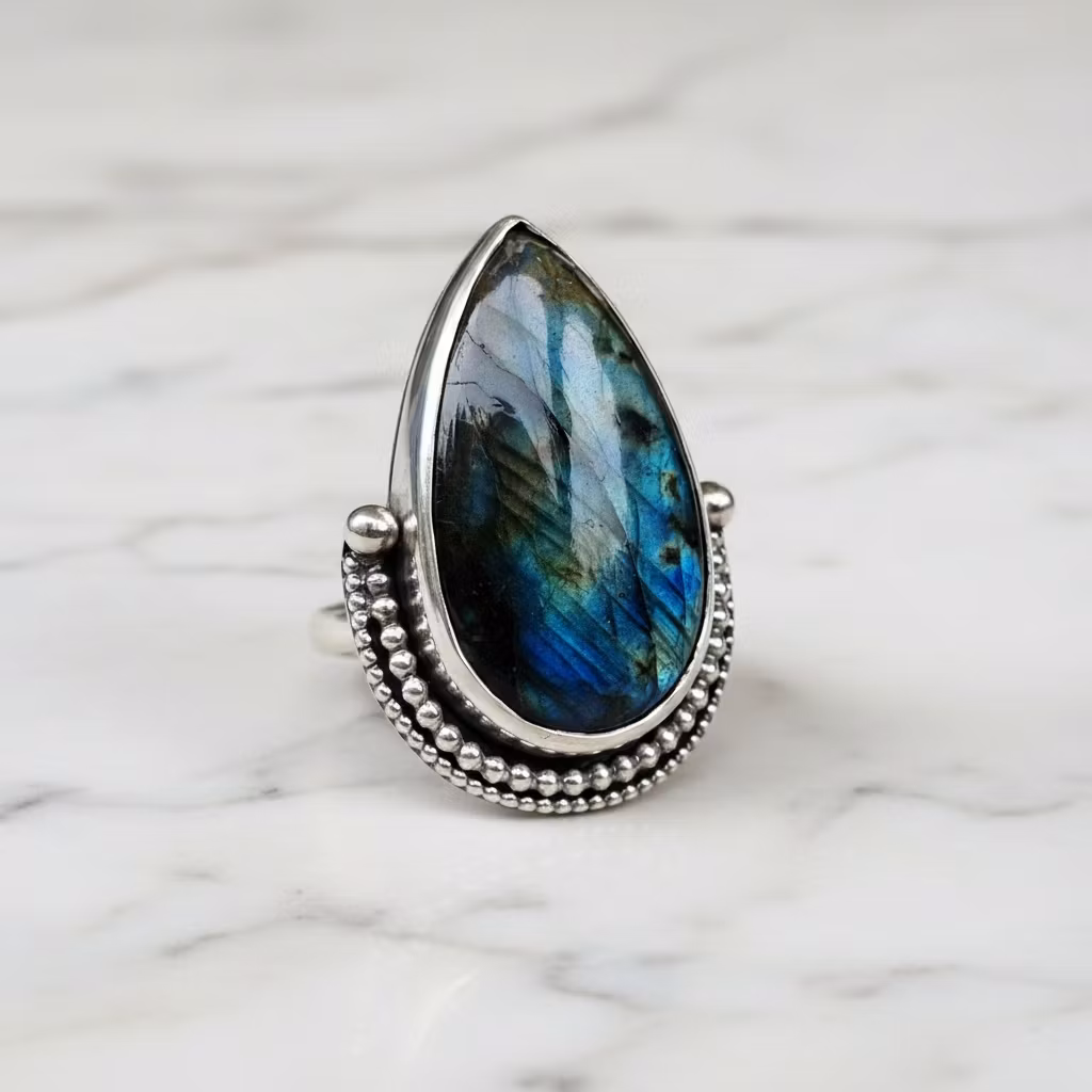 Stor skimrande fin labradorit ring i äkta silver med vacker droppformad labradoritsten med fint skimmer. Ringen är 3mm bred och har ett fönster på baksidan där stenen lyser fint. Labradoritdroppen är 34mm hög med fina detaljer runt stenen. Maffig Statementring skapad i sterling silver med äkta naturlig labradoritsten med unikt naturligt mönster. Snygg ring för dig som älskar stora ringar. Polerduk medföljer.