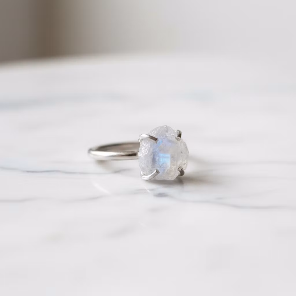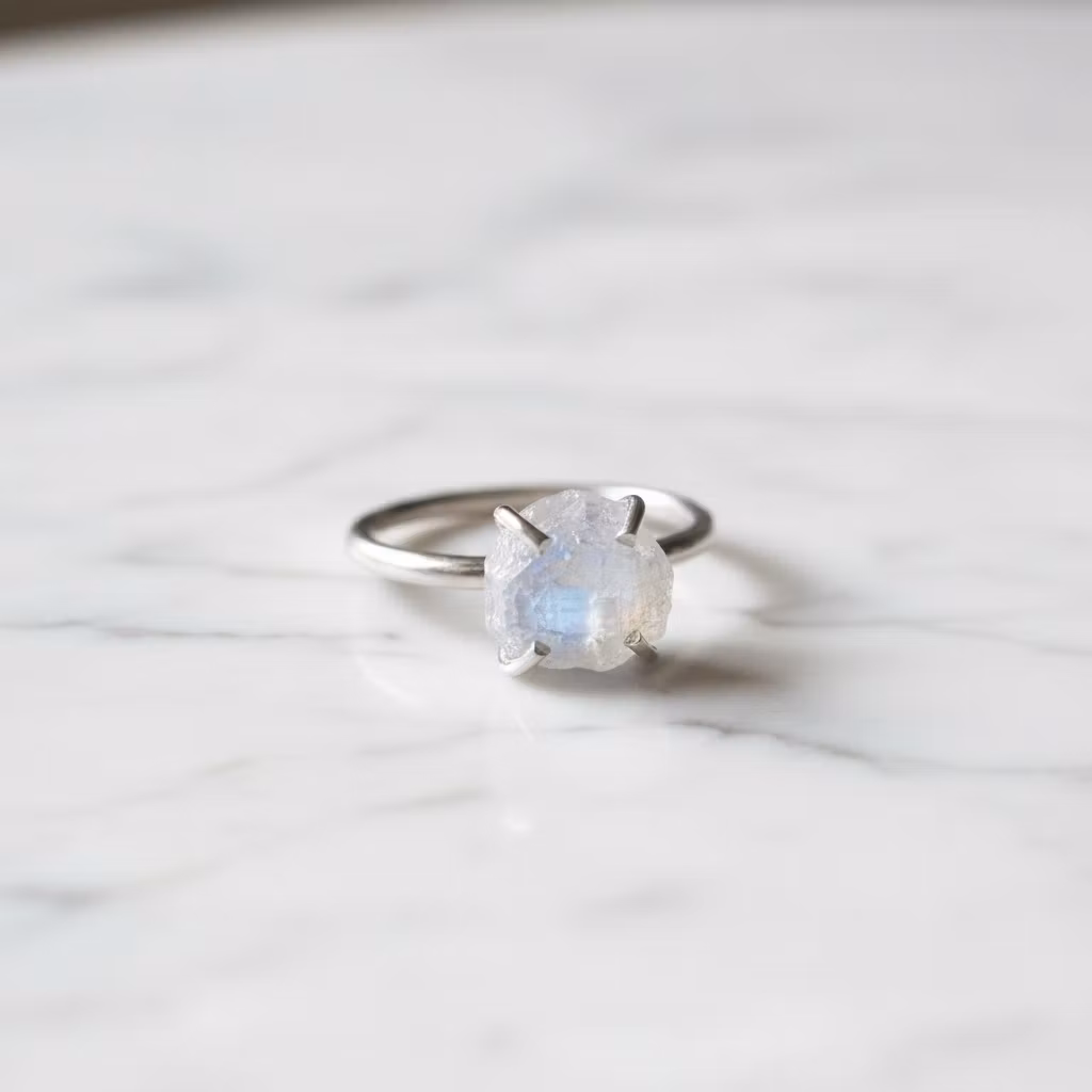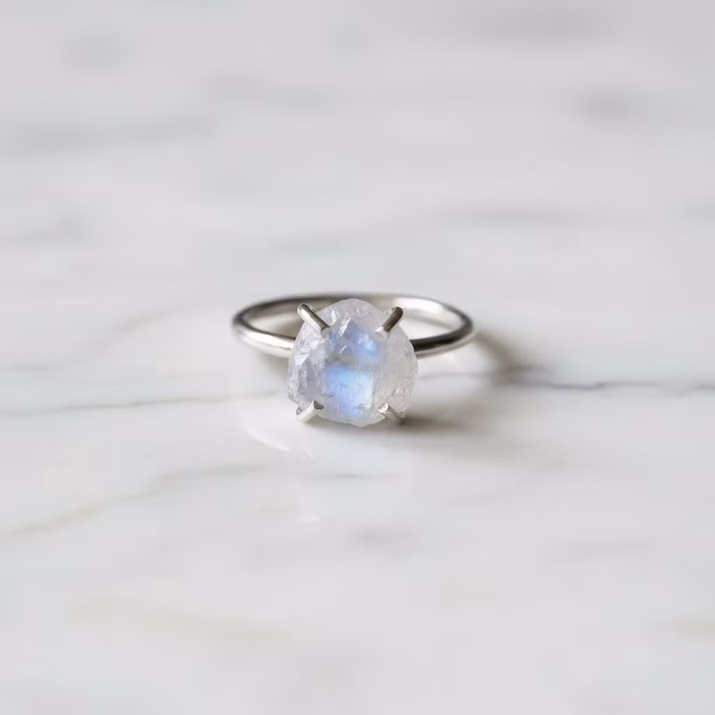 Rå månsten ring i äkta silver med vit vacker regnbågsmånsten i klofattning. Ringen är tillverkad av sterling silver med äkta naturlig regnbågsmånsten i fin glänsande kvalitet. Stenen är från 6mm - 8mm stor. Alla månstenar är unika och ingen sten är den andra exakt likadan. Regnbågsmånsten är en vit kristall som glänser i regnbågens färger när stenen träffas av ljuset. (Stenen på bilderna är 8mm). Polerduk medföljer.
