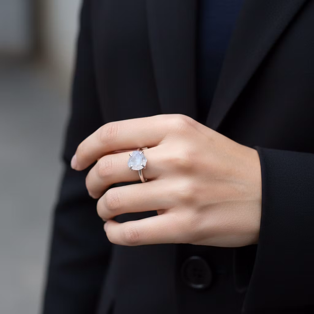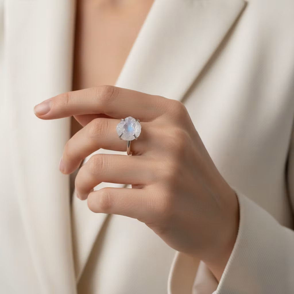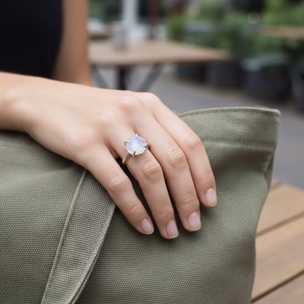 Rå månsten ring i äkta silver med vit vacker regnbågsmånsten i klofattning. Ringen är tillverkad av sterling silver med äkta naturlig regnbågsmånsten i fin glänsande kvalitet. Stenen är från 6mm - 8mm stor. Alla månstenar är unika och ingen sten är den andra exakt likadan. Regnbågsmånsten är en vit kristall som glänser i regnbågens färger när stenen träffas av ljuset. (Stenen på bilderna är 8mm). Polerduk medföljer.