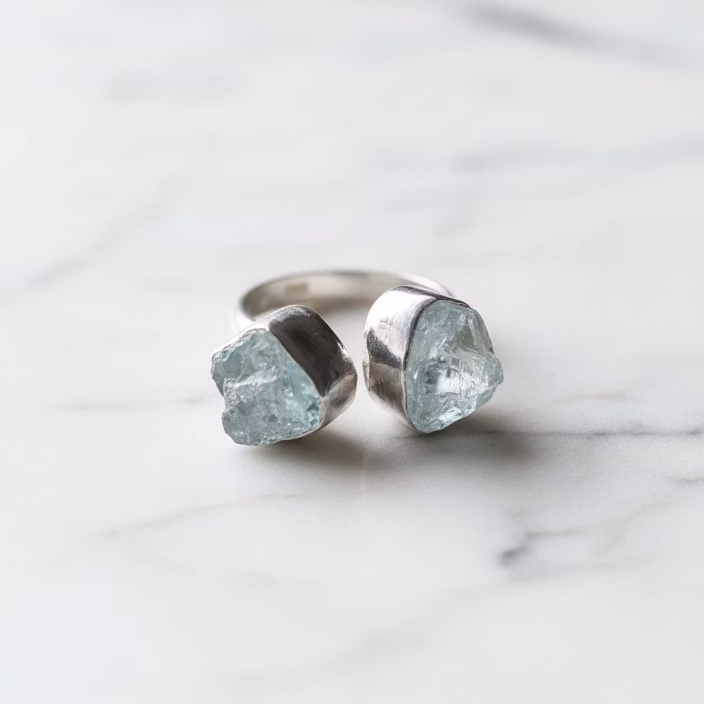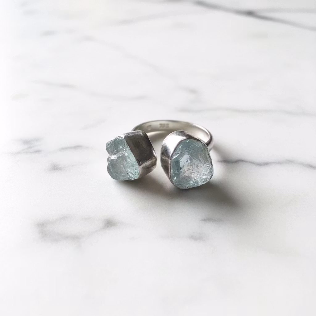 Rå akvamarin ring i äkta silver med två stycken råa naturliga akvamariner. En öppen justerbar silverring med glänsande vackra akvamarin kristaller i mycket fin kvalitet. Ringen är 3mm bred med slät yta. Kristallerna är mellan 8mm -10mm stora. Tvåstensring med grova akvamariner i skinande blankt sterling silver. Ringen har medelstora kristaller som är äkta naturliga. Varje ring är unik, mått och form på kristallerna skiljer sig lite åt. Månadsstensring mars. Polerduk medföljer.