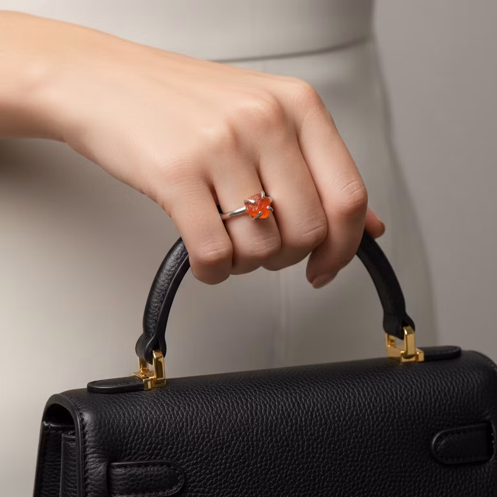 Rå orange karneol ring i äkta silver med liten glänsande karneol sten i klofattning. Ringen är tillverkad i sterling silver med äkta karneol i fantastisk fin kvalitet. Stilren silverring med orange glänsande ädelsten. Stenen är från ca 4mm - 6mm. Orange kristallring i skinande blankt silver. Polerduk medföljer.