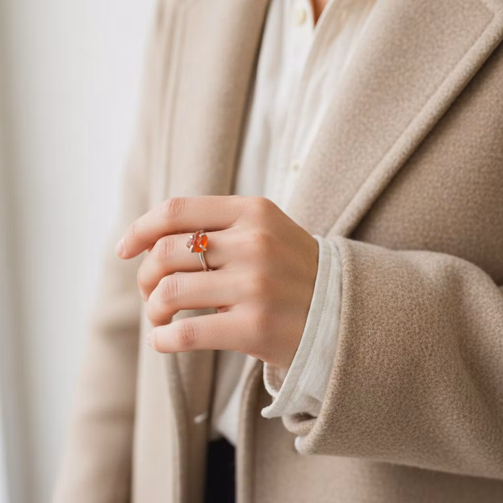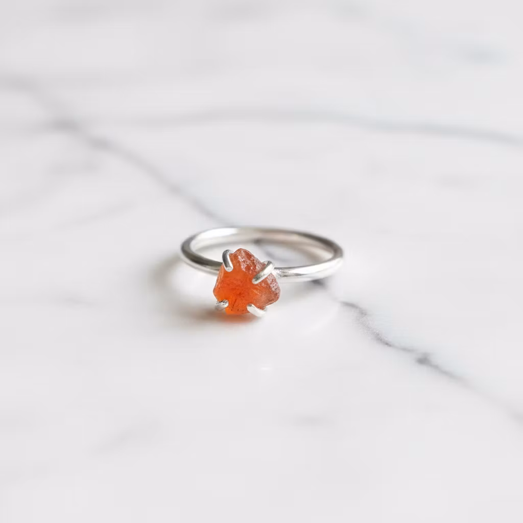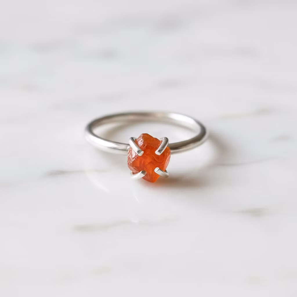 Rå orange karneol ring i äkta silver med liten glänsande karneol sten i klofattning. Ringen är tillverkad i sterling silver med äkta karneol i fantastisk fin kvalitet. Stilren silverring med orange glänsande ädelsten. Stenen är från ca 4mm - 6mm, varje sten är unik. Orange kristallring i skinande blankt silver. Polerduk medföljer.
