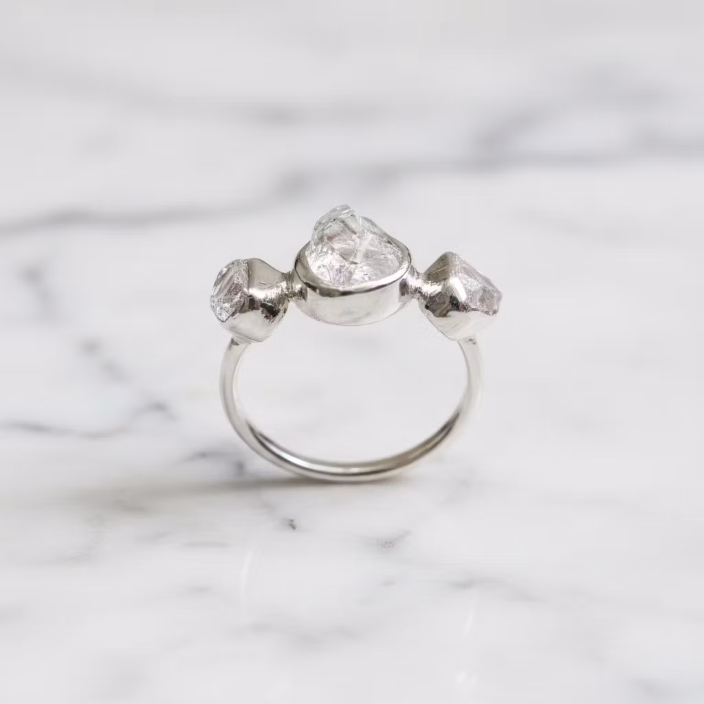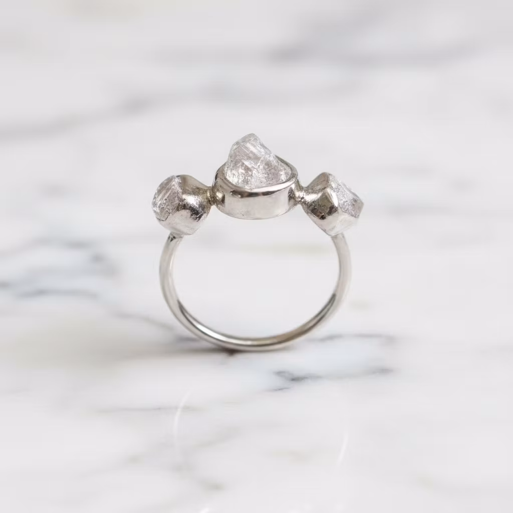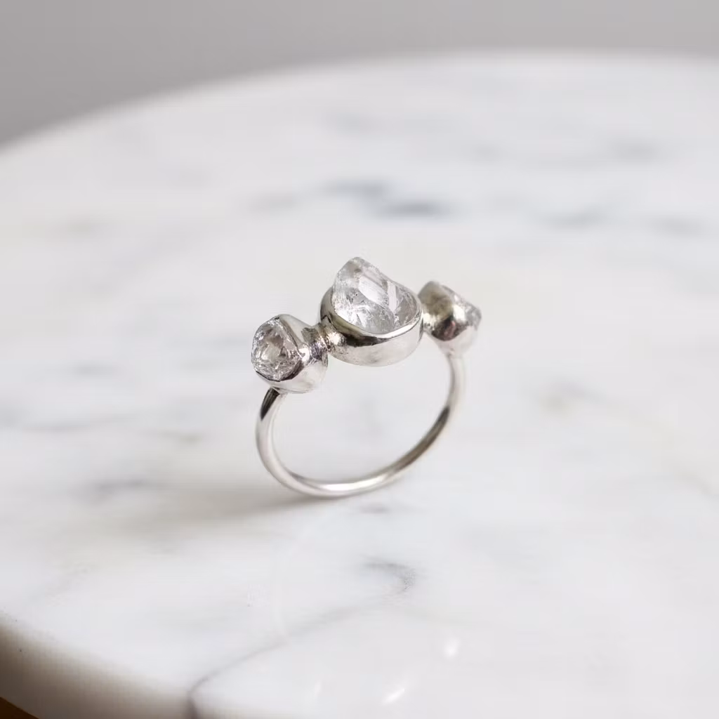Rå klar kristallring i äkta silver med tre stycken kristaller. Upptäck den vackra råa kristallringen i silver, som är försedd med klara fina glänsande kristaller på rad. Den här trestensringen har vita genomskinliga kvarts kristallstenar av högsta kvalitet, som glittrar och glänser vackert. Kristallerna är 4mm - 6mm, medan den största kristallen mitt på ringen är 6mm - 8mm. Ringen är 2mm bred och tillverkad i sterling silver. De öppna baksidorna på kristallerna gör att ljuset glittrar fint igenom dem. Alla ringar är unika, eftersom kristallerna är äkta naturliga. Polerduk medföljer.