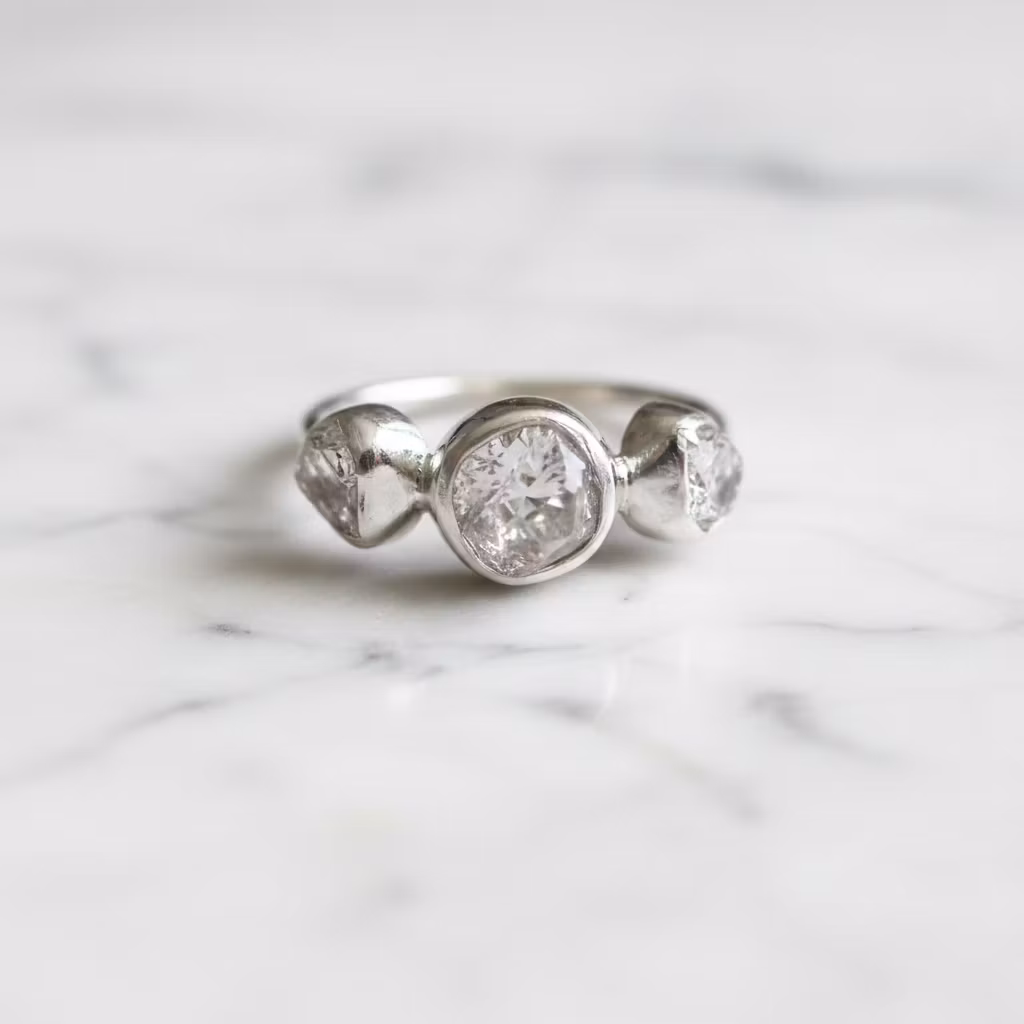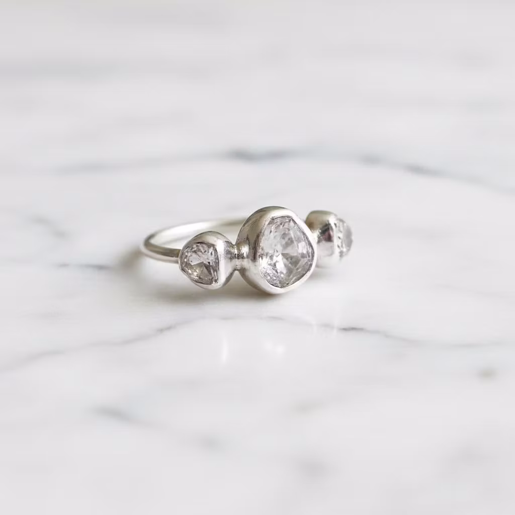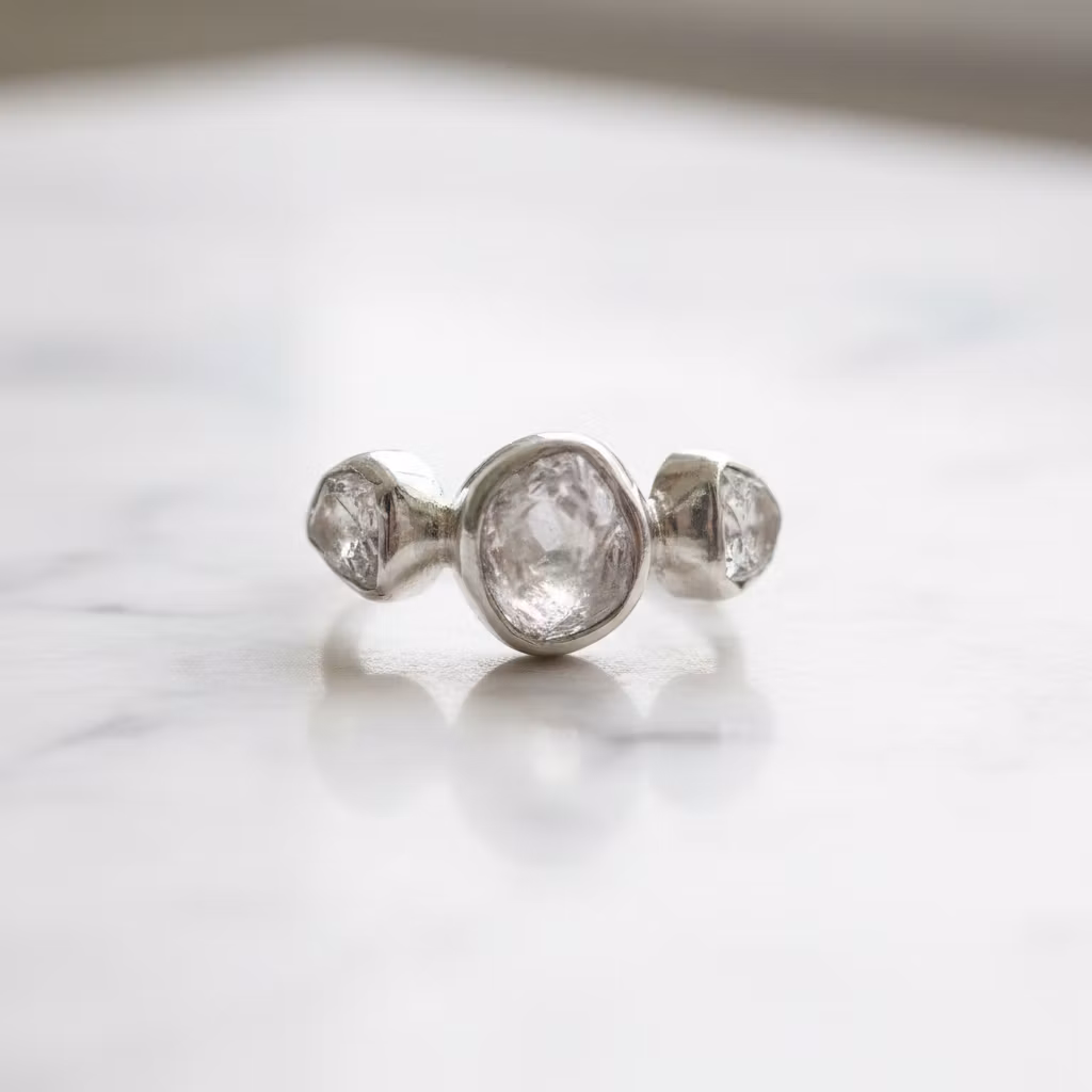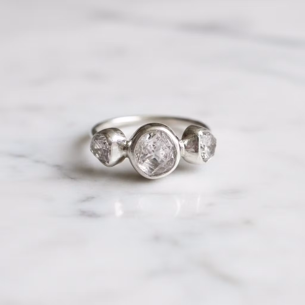 Rå klar kristallring i äkta silver med tre stycken kristaller. Upptäck den vackra råa kristallringen i silver, som är försedd med klara fina glänsande kristaller på rad. Den här trestensringen har vita genomskinliga kvarts kristallstenar av högsta kvalitet, som glittrar och glänser vackert. Kristallerna är 4mm - 6mm, medan den största kristallen mitt på ringen är 6mm - 8mm. Ringen är 2mm bred och tillverkad i sterling silver. De öppna baksidorna på kristallerna gör att ljuset glittrar fint igenom dem. Alla ringar är unika, eftersom kristallerna är äkta naturliga. Polerduk medföljer.