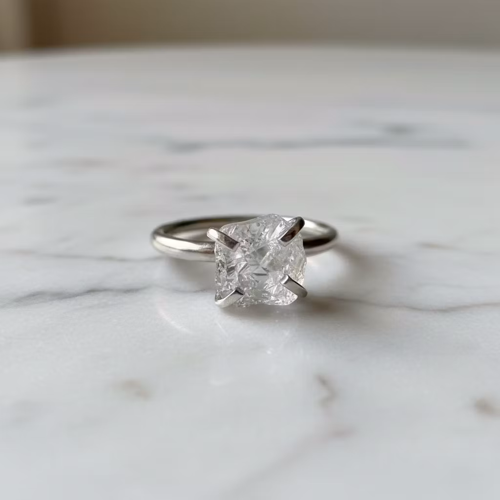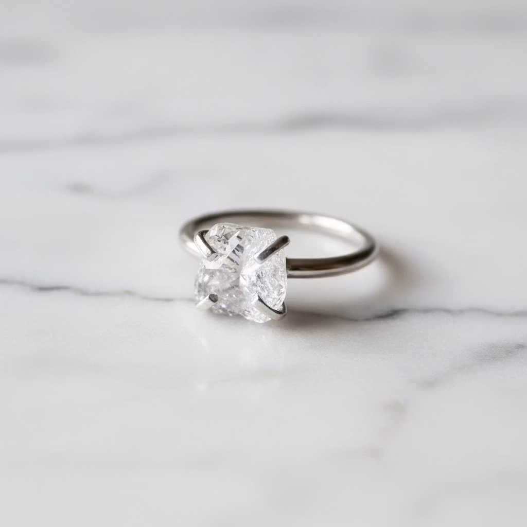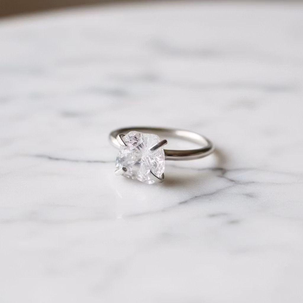 Silverring med rå klar kvartskristall i klofattning. Ringen är 2mm tjock och prydd med 6mm - 8mm stor rå glänsande kristall. Ringen är tillverkad av sterling silver med Kristall i mycket fin kvalitet. Genomskinlig kristall ring för eleganta tillfällen. Polerduk medföljer.