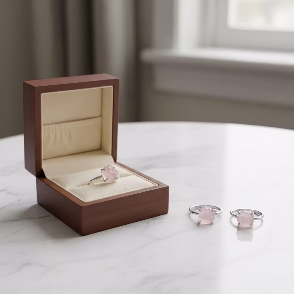 Rå rosenkvarts ring i äkta silver med rosa grovslipad kristall i klofattning. Ringen är tillverkad i äkta silver med naturlig rosenkvarts kristall. Kristallen är ca 6mm - 8mm och ringen 2mm bred. Alla kristaller är unika i form och mått. Månadsstensring oktober. Polerduk medföljer.