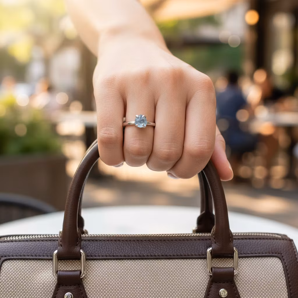 Silverring med liten rå blå akvamarin sten i klofattning. Slät ring i äkta silver med rå naturlig akvamarinkristall i fin glänsande kvalitet. Kristallen är 4mm - 5mm. Elegant ring med glänsande klar fin akvamarin. Kristallring med månadssten mars. Polerduk medföljer.