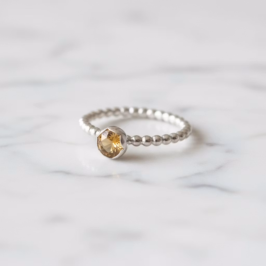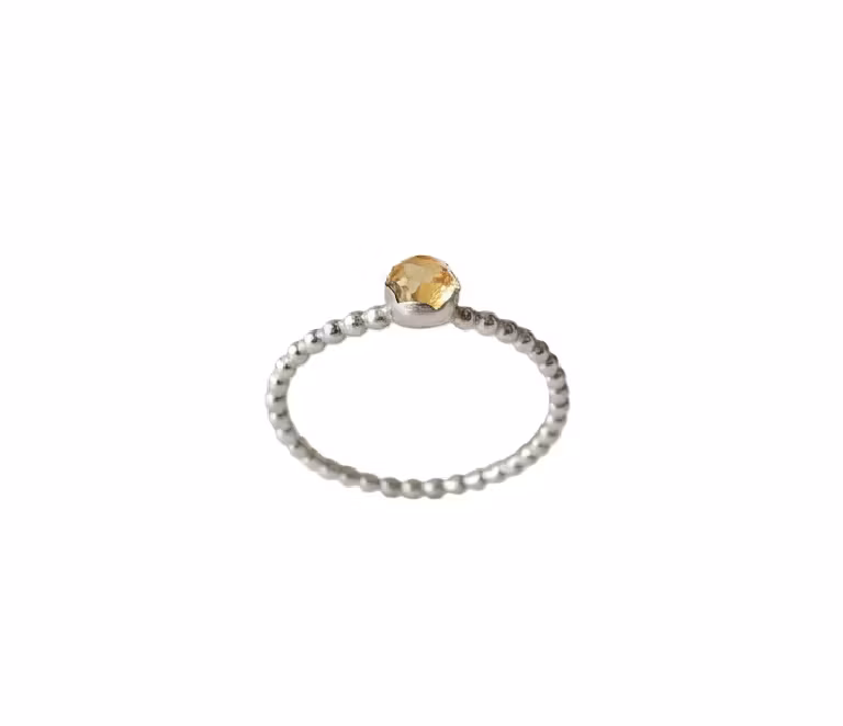 Kulring i äkta silver med rund gyllene citrin sten. Ringen är skapad av sterling silver med 5mm fasettslipad gyllengul citrin. Ringen är 2mm bred med glänsande blank silveryta. Månadsstensring november. Polerduk medföljer.