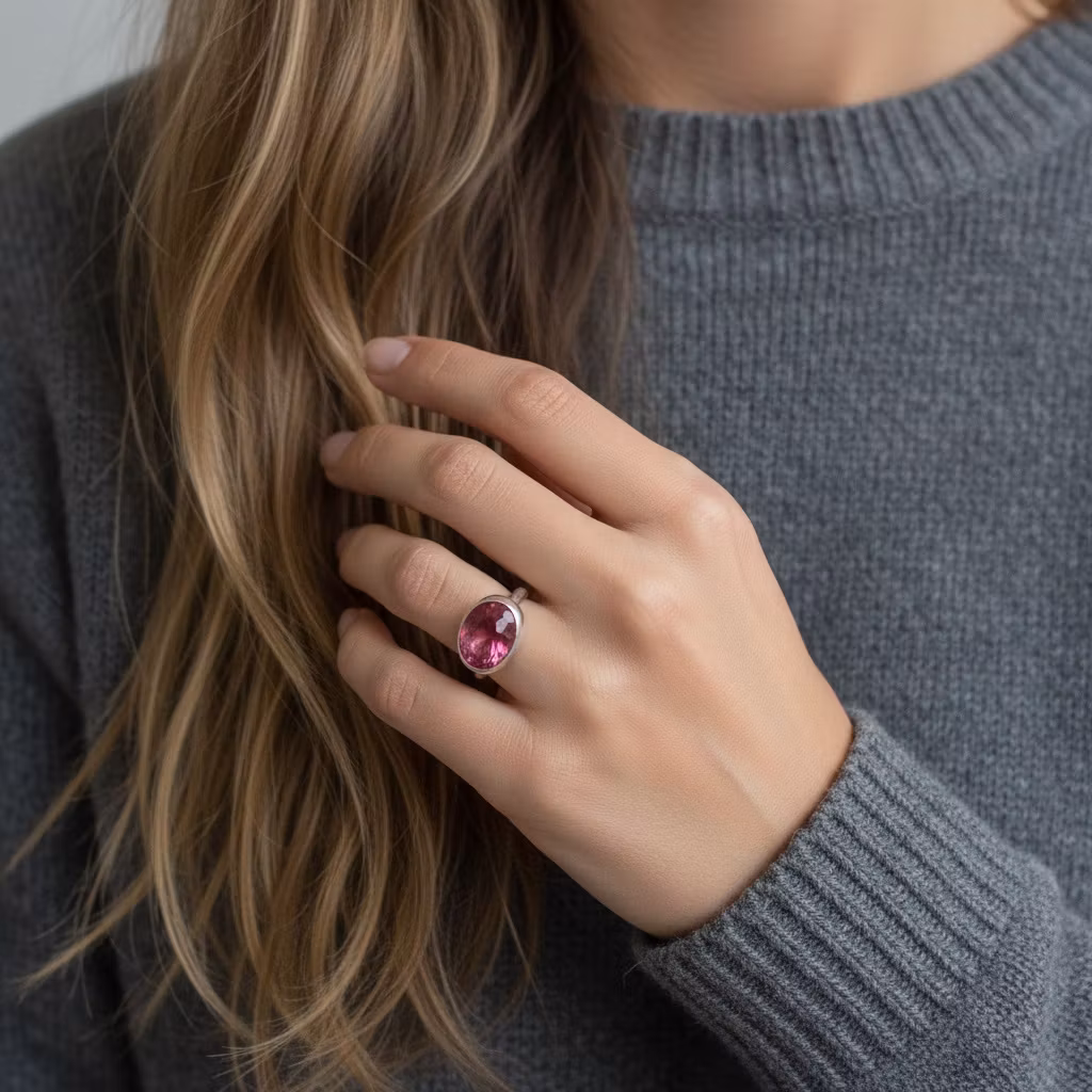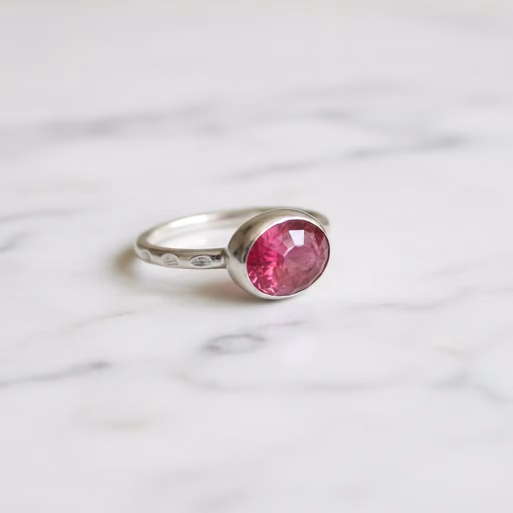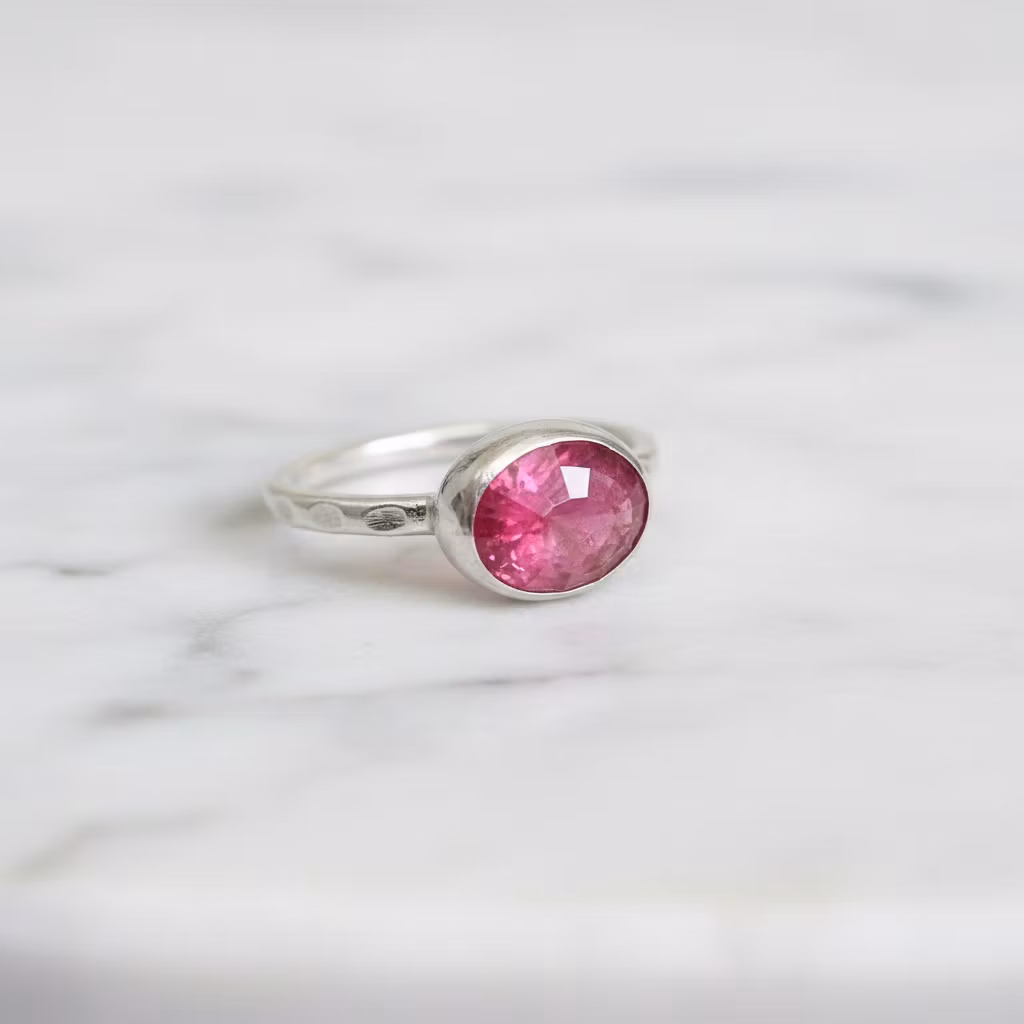 Upptäck den här eleganta silverringen med en mönstrad design och en vacker rosa oval safirsten. Ringen är tillverkad i sterling silver och har en fasettslipad glänsande härligt rosa safir. Stenen är 10mm stor och ligger placerad horizontal. Månadsstensring september. Polerduk medföljer.