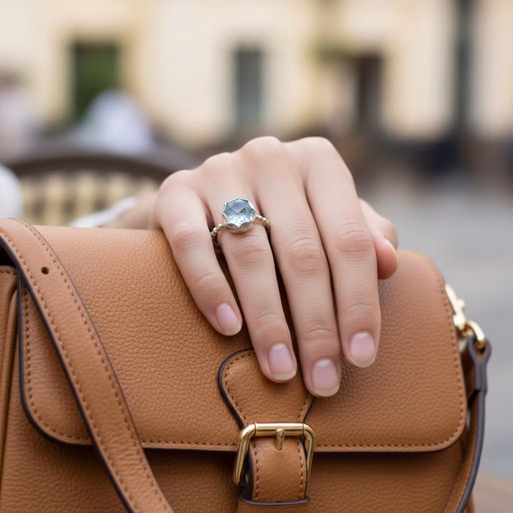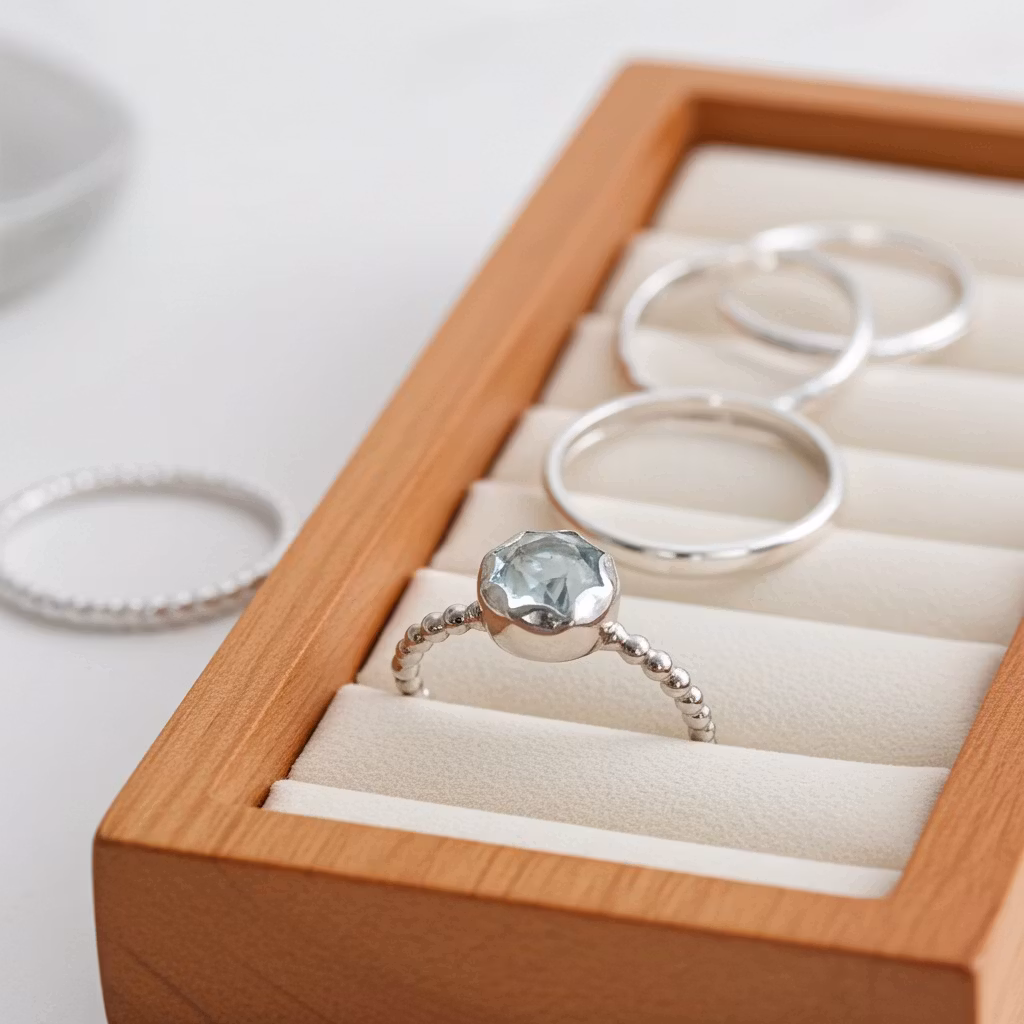 Silverring med rund fasettslipad akvamarin med vågig kant runt stenen. Vacker kulring i äkta silver med ca 8mm - 8,5mm rund aquamarinblå sten. Ringen är 2mm tjock och tillverkad av sterling silver. Polerduk medföljer.