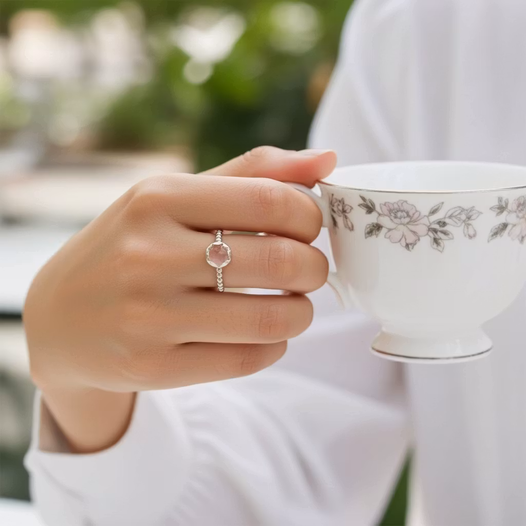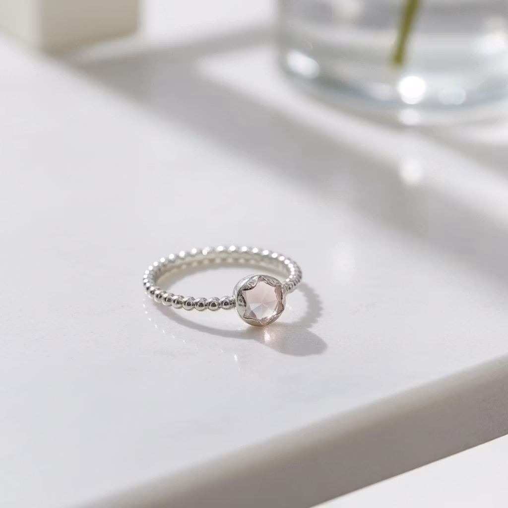 Silverring med rosa rund slipad morganit med vågig kant runt stenen. Ringen är 2mm tjock med 6mm - 7mm ljusrosa sten. Kulringen är skapad av äkta silver med persikorosa, blekrosa, morganit. Polerduk medföljer.