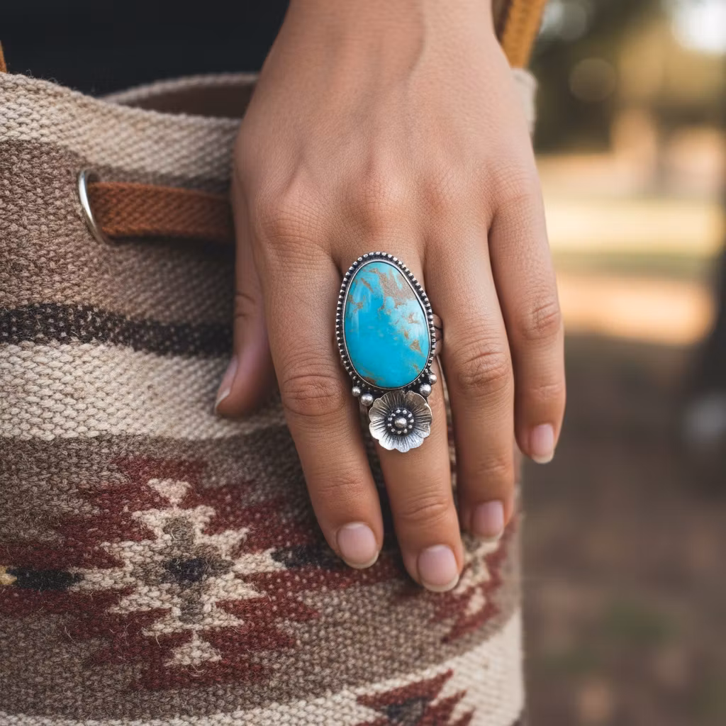 Stor turkos ring skapad av 925 sterling silver med äkta Kingman turkos sten. Designad originalring med blomma och små kulor vid stenen. Ringen har en bohemisk stil och är 4mm bred och 34mm hög. Den här stora unika turkosringen finns i ett exklusivt exemplar då turkosen är autentisk. Statementring med stor äkta turkos för en iögonfallande stil. Månadsstensring december. Polerduk medföljer.