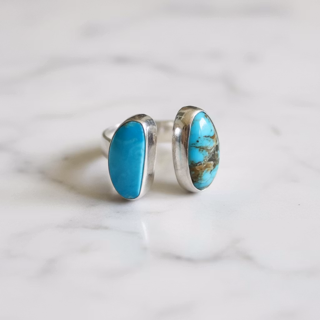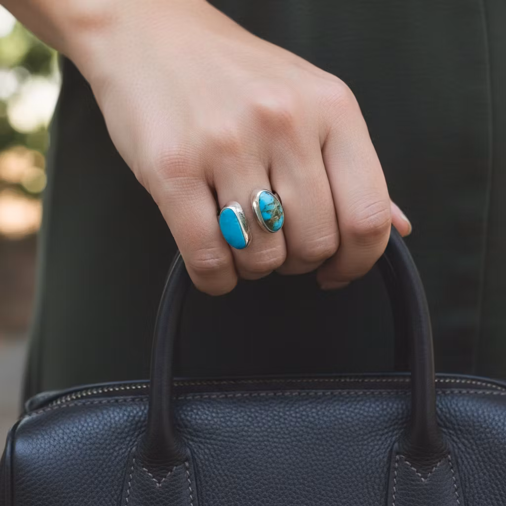 Öppen justerbar silverring med två stycken högkvalitativa Kingman turkos stenar. Ringen är skapad av sterling silver och är 3mm bred. Turkoserna är 15mm höga. Då ringen är justerbar är det möjligt att ha ringen på flera olika fingrar. Den här exklusiva turkosringen finns endast i ett originalexemplar. Perfekt för en unik stil. Polerduk medföljer.