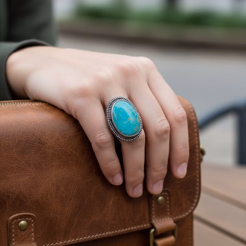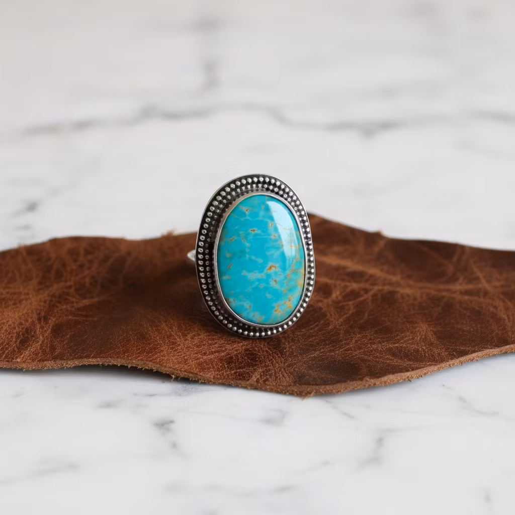 Stor Statementring med äkta naturlig Kingman turkos i mycket fin kvalitet. Ringen är tillverkad av sterling silver med stilrena oxiderade detaljer. Ringen är 3mm bred och är halvrund i formen. Den stora turkosringen är 30mm hög med oval högkvalitativ turkos. Turkosen har bruna fina ådror. Turkosringen är perfekt för dig som älskar stora unika ringar. Polerduk medföljer.