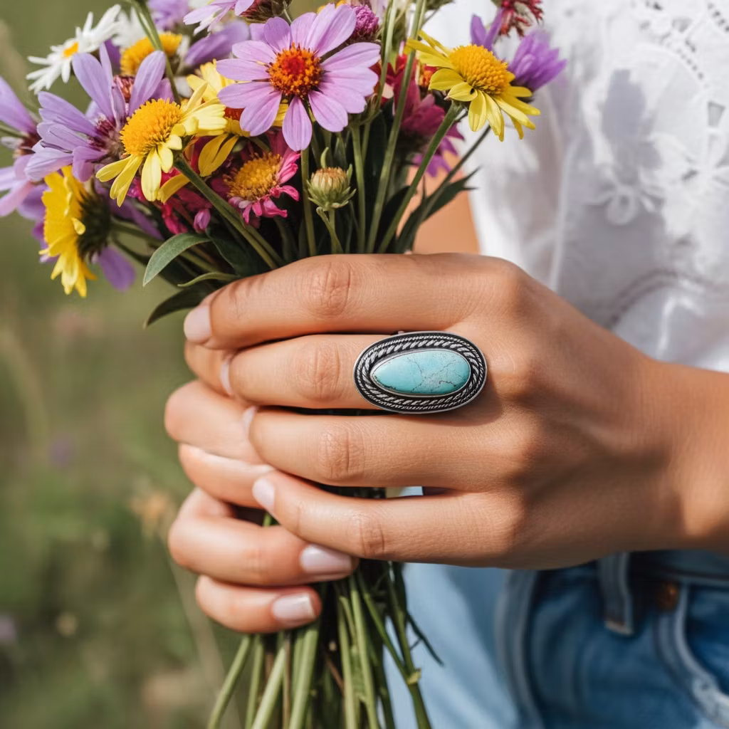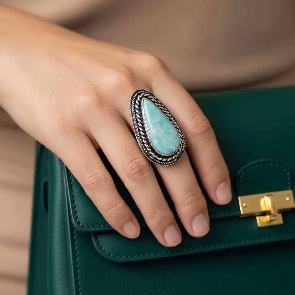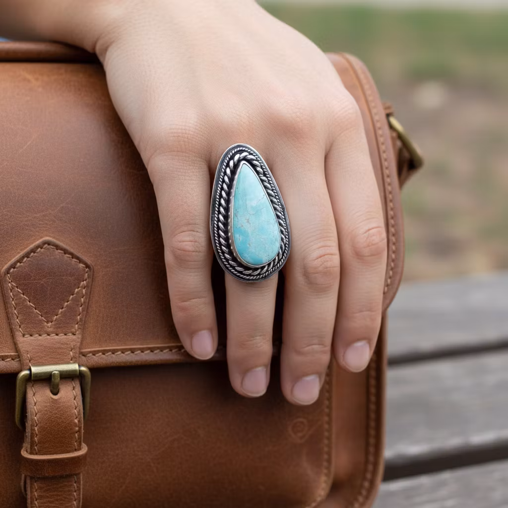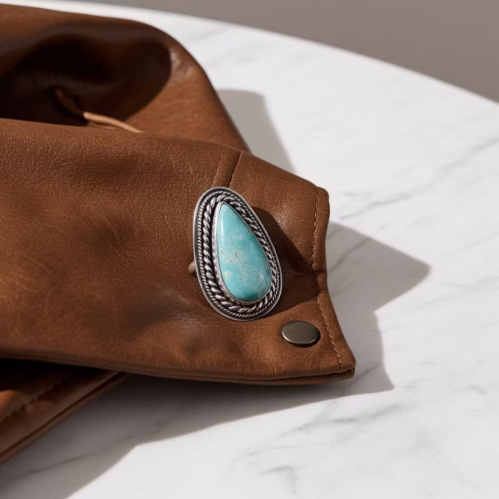 Stor droppformad turkos ring i silver med äkta Royston turkos i mycket fin kvalitet. Ringen är tillverkad i äkta silver med stor turkos sten i ljust turkosa nyans med ådringar. Ringen är 2,5mm bred och 30mm hög. Stor elegant turkosring med fina oxiderade detaljer runt stenen. Perfekt för dig som älskar stora ringar. Polerduk medföljer.