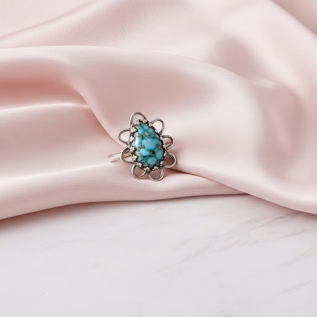 Turkos ring skapad av sterling silver med äkta naturlig turkos droppe. Turkosen är av Vit vatten turkos med matrismönster av pyrit. Den unika turkosringen är 18mm hög med dekorativ kant runt stenen. Ringen finns i ett unikt original exemplar då stenen är naturlig. Polerduk medföljer.