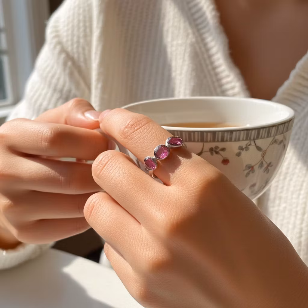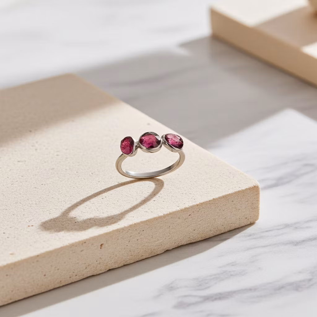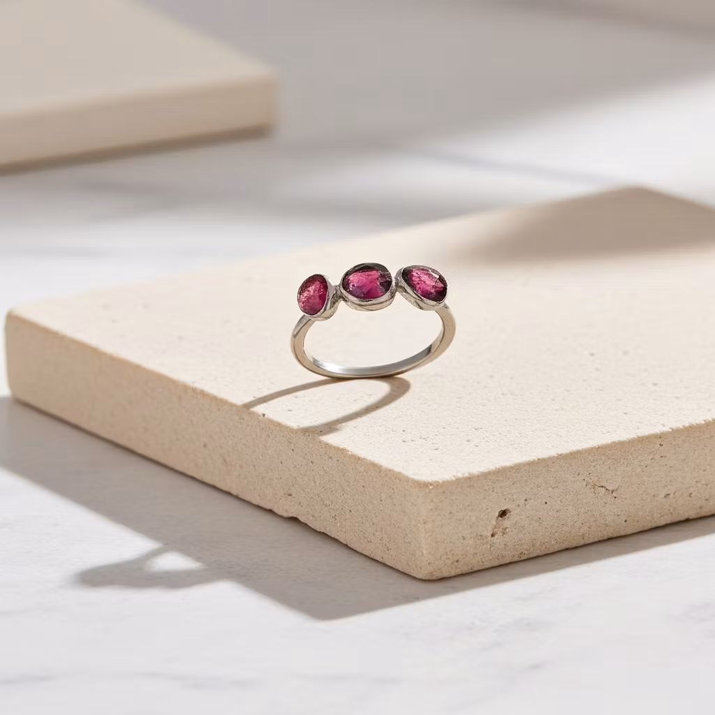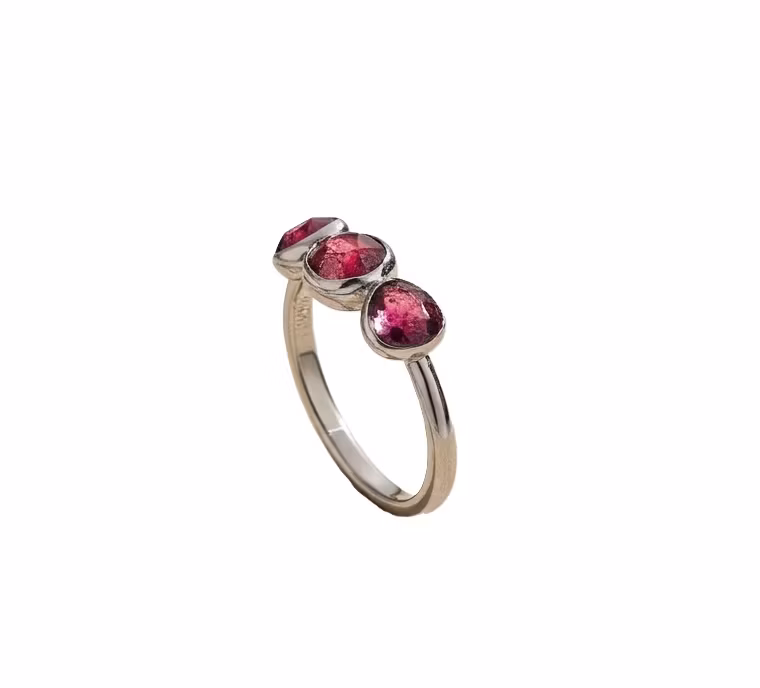 Vacker trestensring rosa turmalin med små slipade turmalin stenar i olika rosa nyanser. Ringen är tillverkad i äkta silver med tre stycken glänsande stenar i cerise rosa nyans. Ringen är 2mm tjock och har en slät yta. Rosa turmalin ring i skinande blankt sterling silver. Polerduk medföljer.