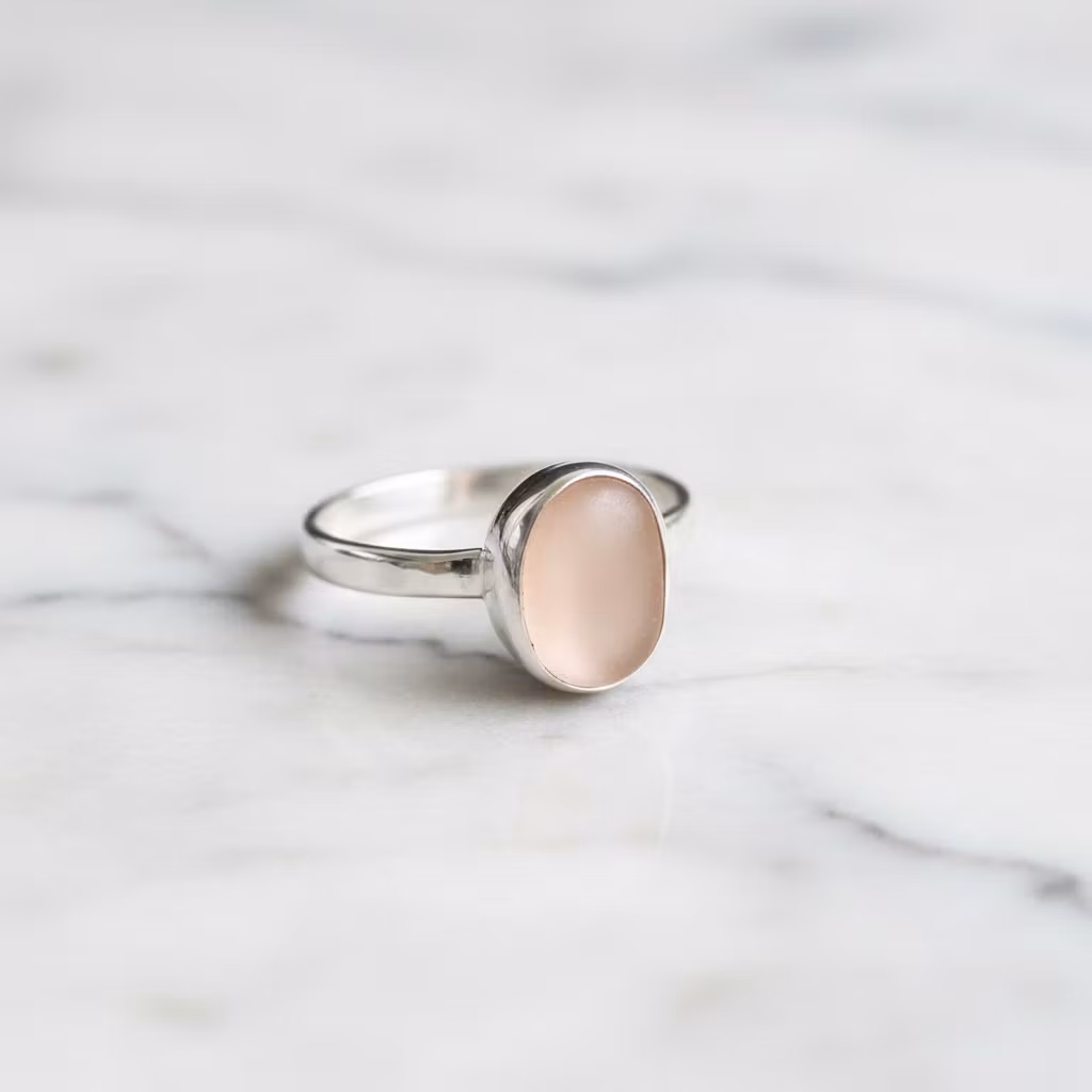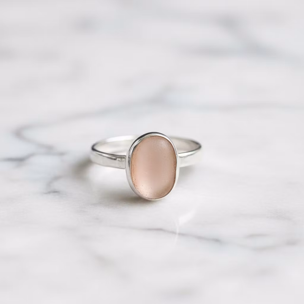 Ring i äkta silver med rosa sjöglas i ljusrosa nyans. Skinande blank silverring med hamrad yta och glas från havet. Ringen har en bredd på 3mm och är halvrund i formen. Alla sjöglas stenar är olika i form, tjocklek och mått, vilket gör varje ring unik. Då sjöglaset är äkta kan ojämnheter förekomma, detta är helt naturligt då det är äkta glas från havet. Ring med ljusrosa strandglas. Polerduk medföljer.