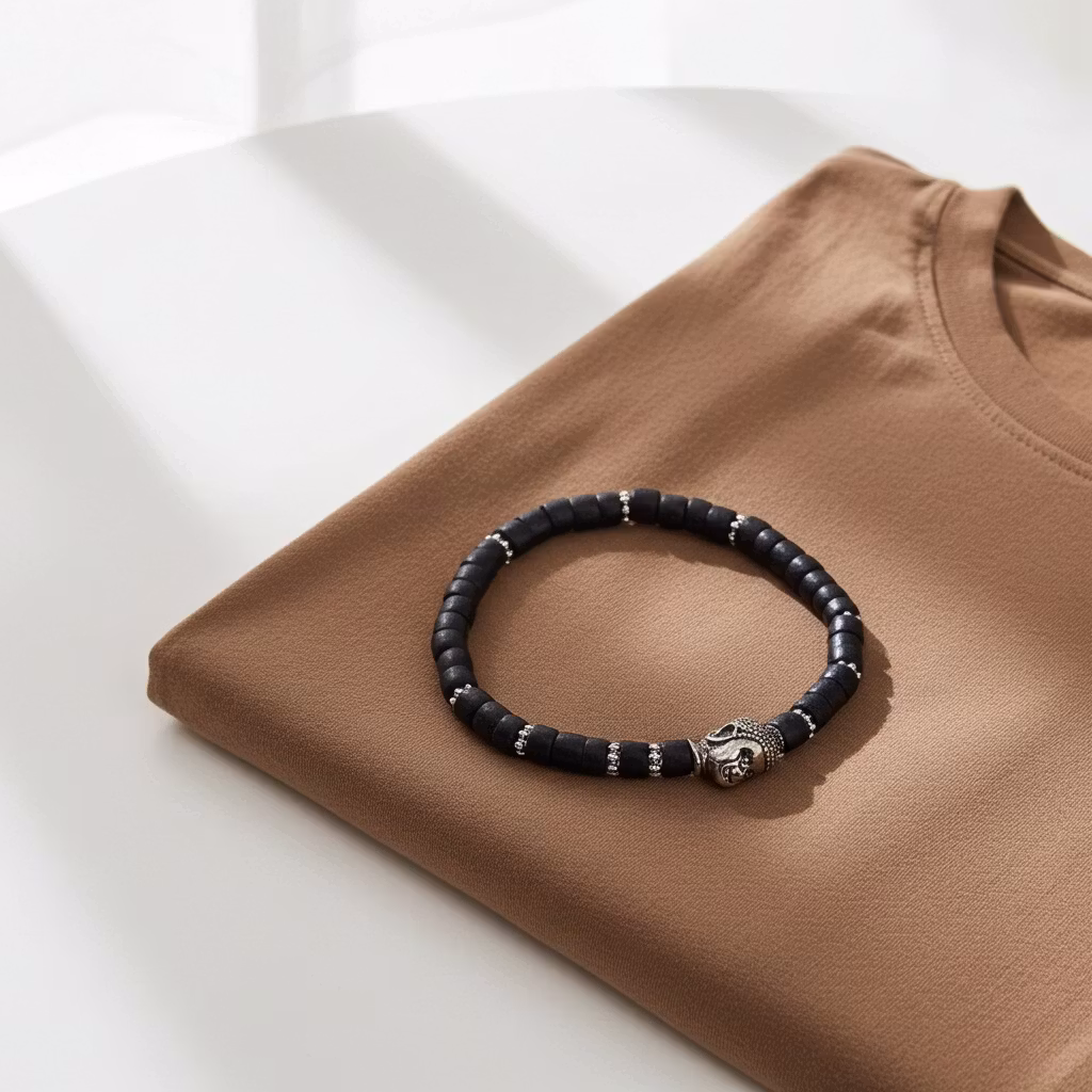 Svart smalt Buddha armband med 4mm små svarta kokospärlor. Armbandet är av naturpärlor med silverpläterad fint Buddha huvud och diskreta detaljer. Perfekt för varje tillfälle.