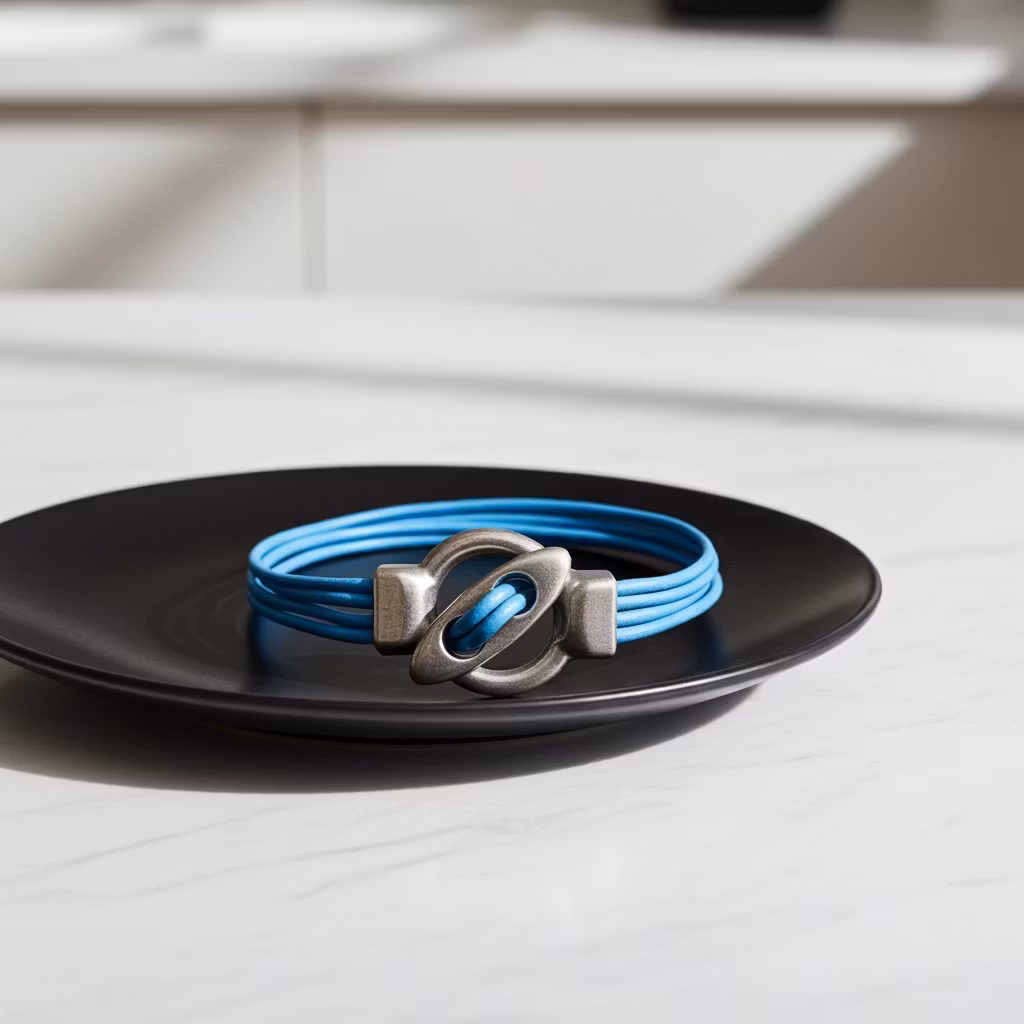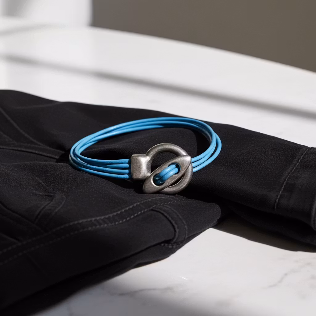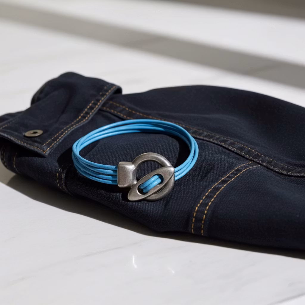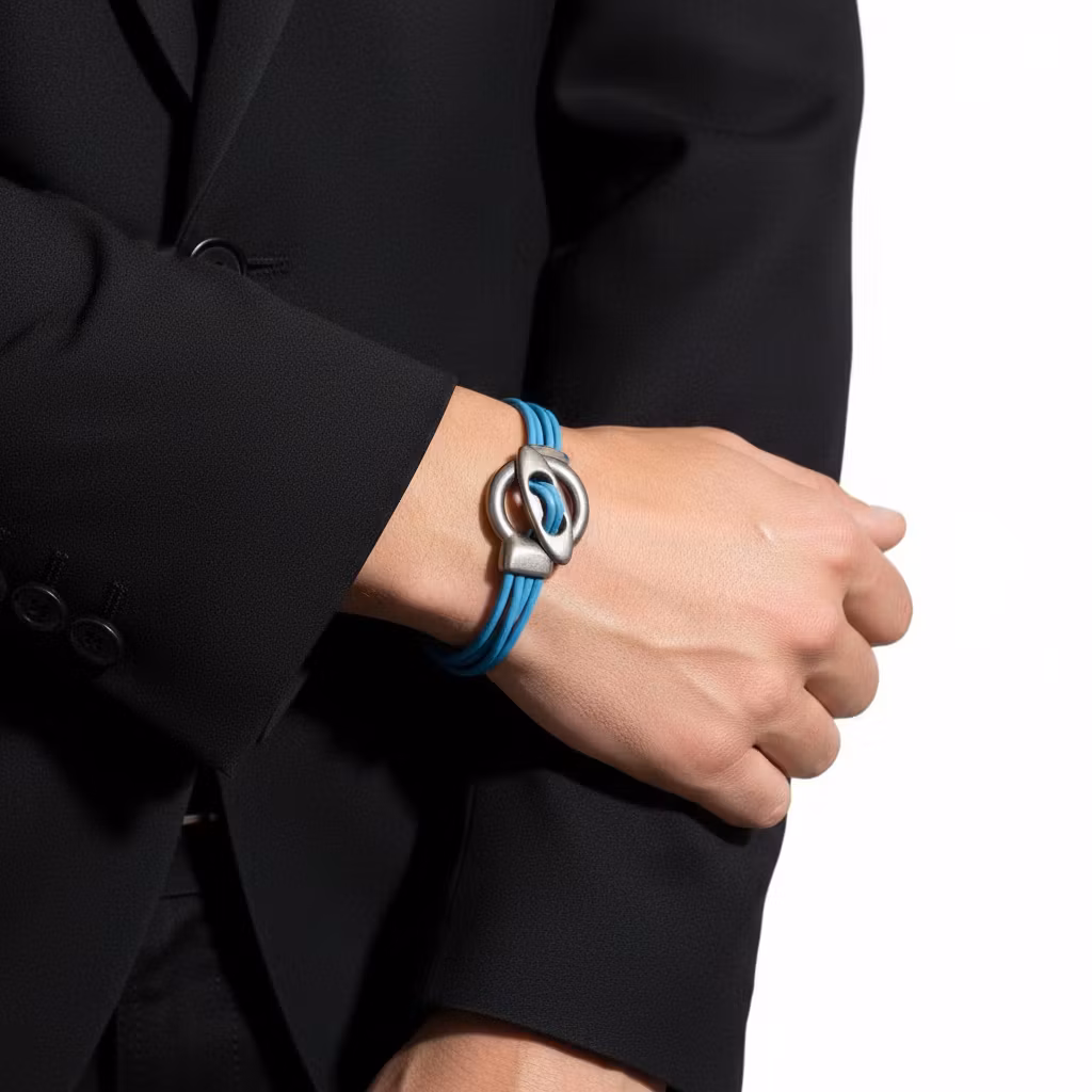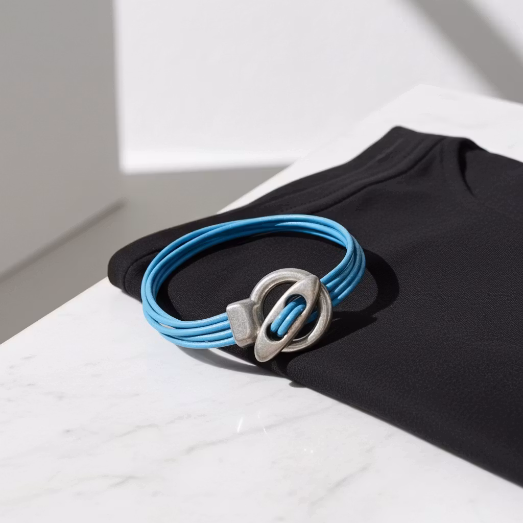 Blått 4-rader läderarmband med stort stilrent toggle lås pläterat i 999-finsilver. Låset har en antik silver finish. Läderremmarna är 2mm tjocka av äkta silver. Armbandet sitter bäst tight runt handleden.