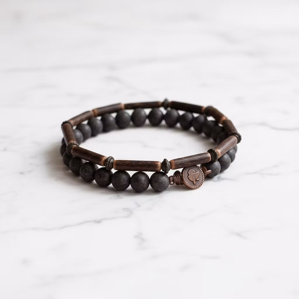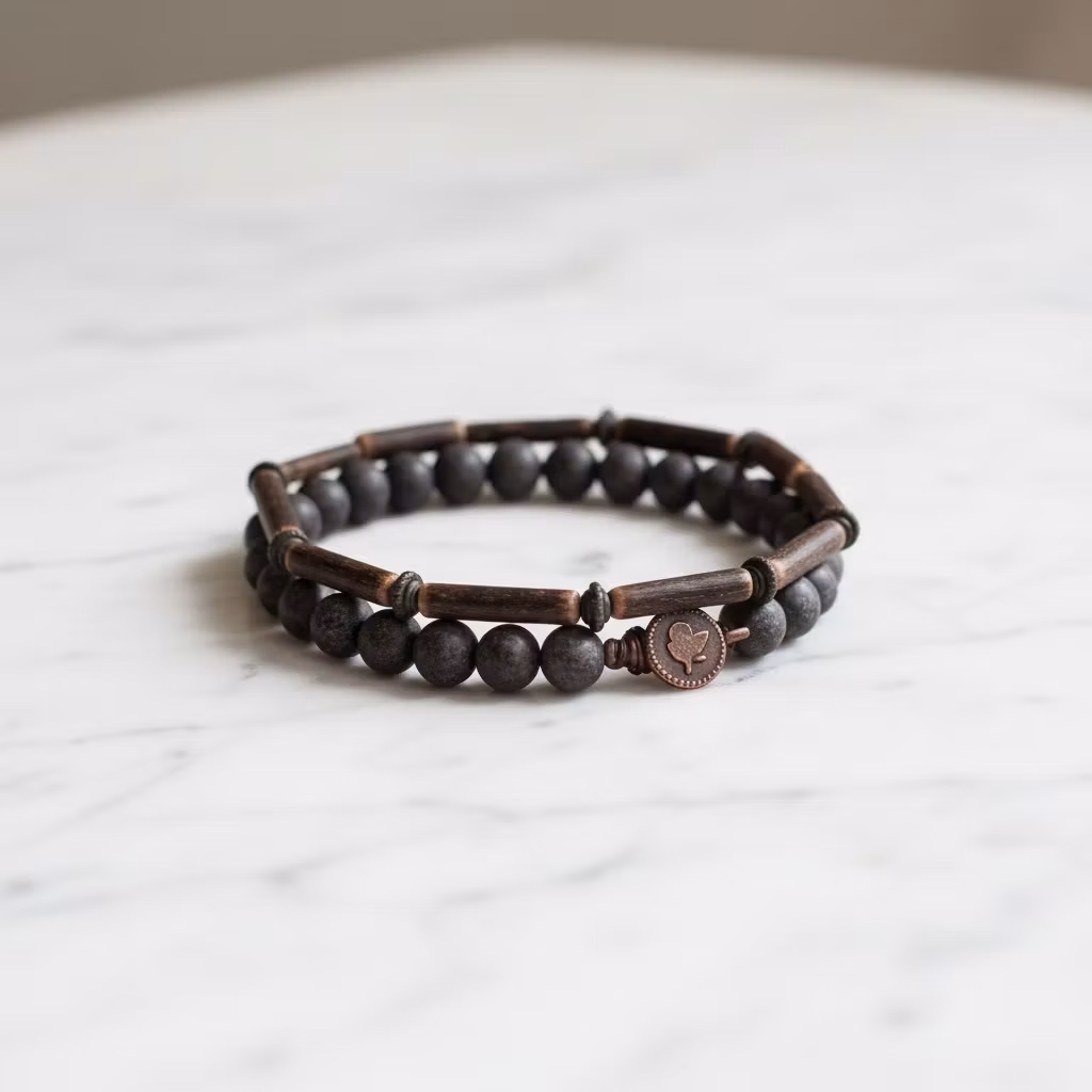 Set med 2 stycken bruna elastiska herrarmband med berlock och detaljer i koppar. Setet innehåller ett brunt obsidian armband med ett matchande brunt smalt armband av avlånga kokospärlor. Trendigt armbandsset med naturstenar i bruna fina nyanser.