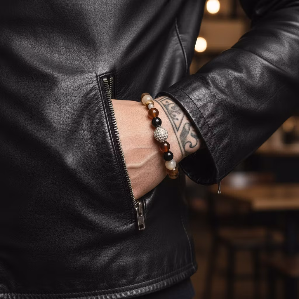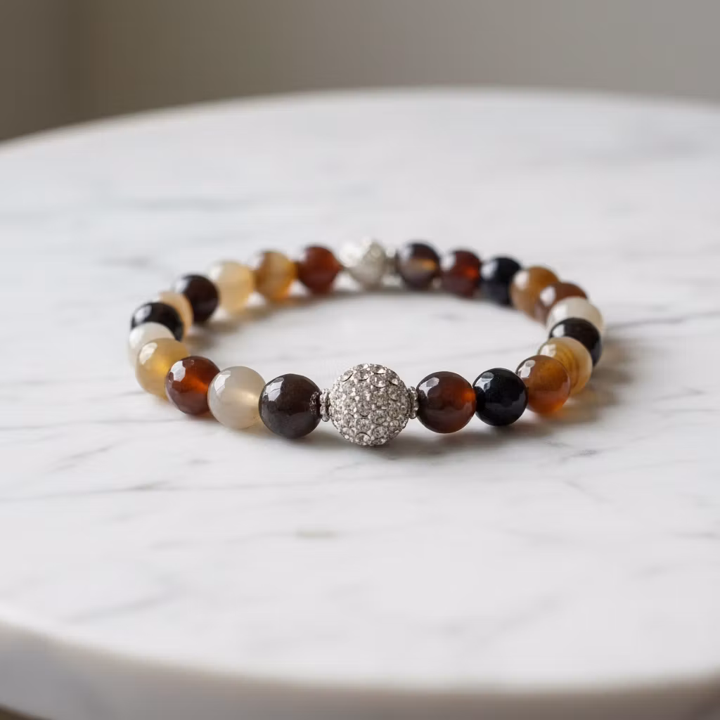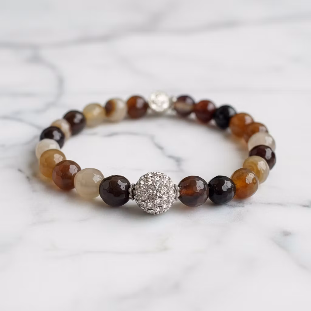Brunt fasettslipat agat armband med en mix av glittrande fina bruna agat stenar med stasskula i fokus. Stenarna är 8mm stora. Elastiskt armband med brunmixade ädelstenar och liten berlock. Perfekt armband för dig som gillar smycken med elegant bling.