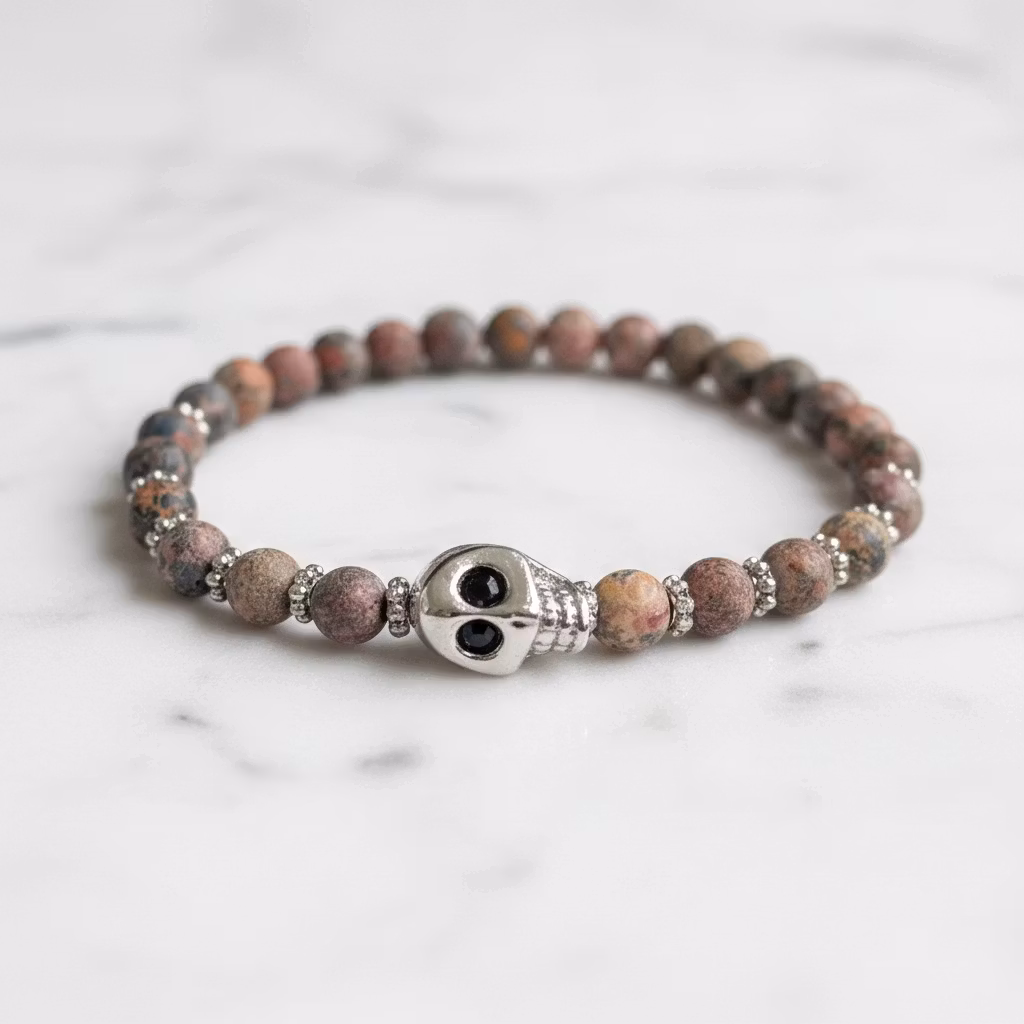 Döskalle armband med röda Jaspis stenar och silverpläterad döskalle med ögon som blingar. Elastiskt armband med 6mm leopardskinn Jaspis i rödbruna jordnära nyanser. Trendigt varje dag armband för honom.