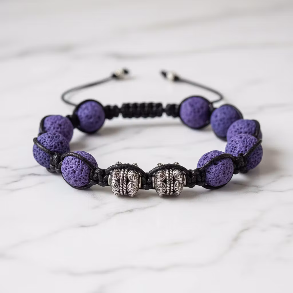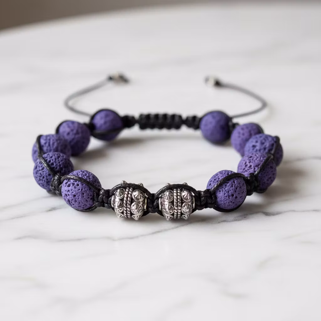 Flätat herrarmband i svart tråd med lila runda lavastenar. Makraméflätat lava armband med fina stilrena detaljer. Det unika lava armbandet finns endast i ett exklusivt exemplar. Lila lava armband som passar för alla tillfällen.
