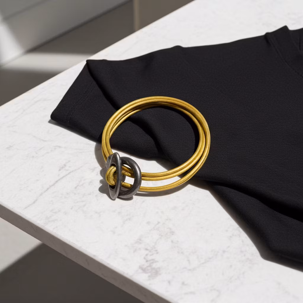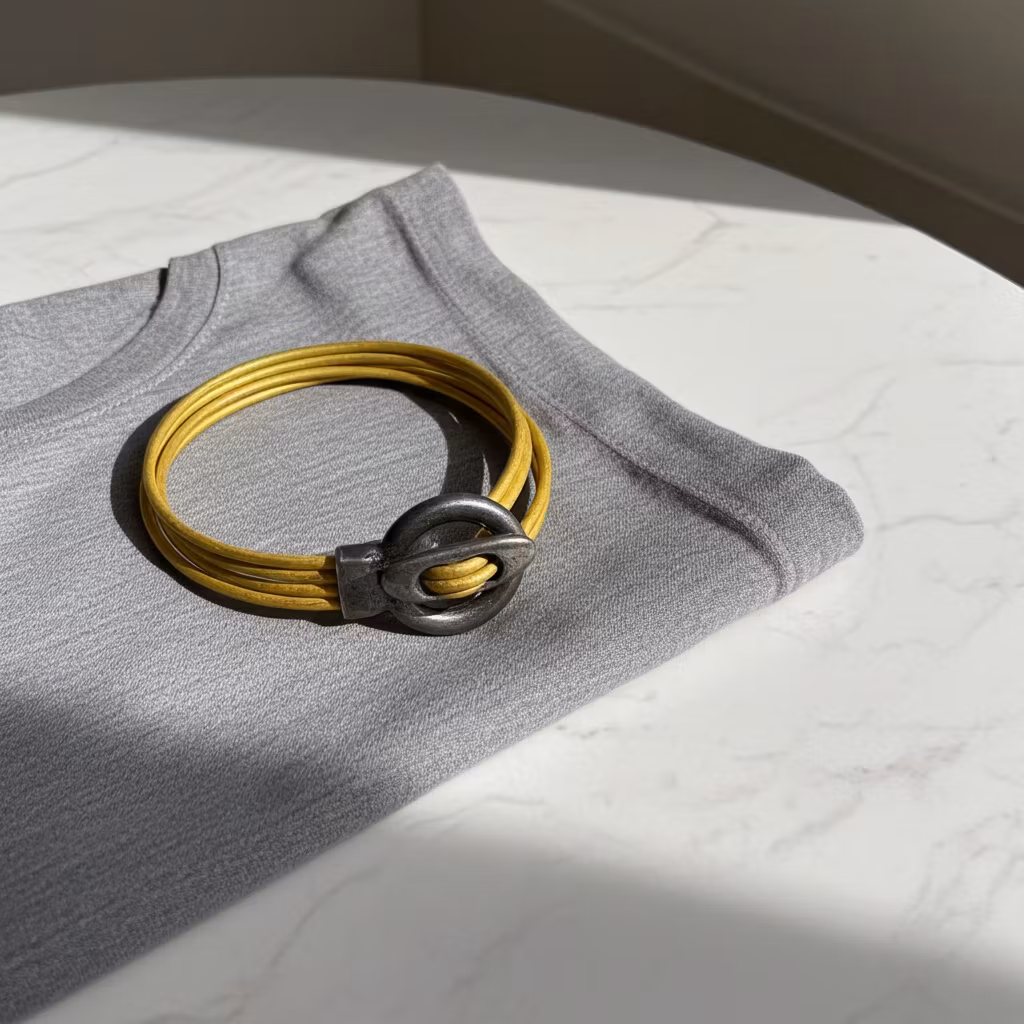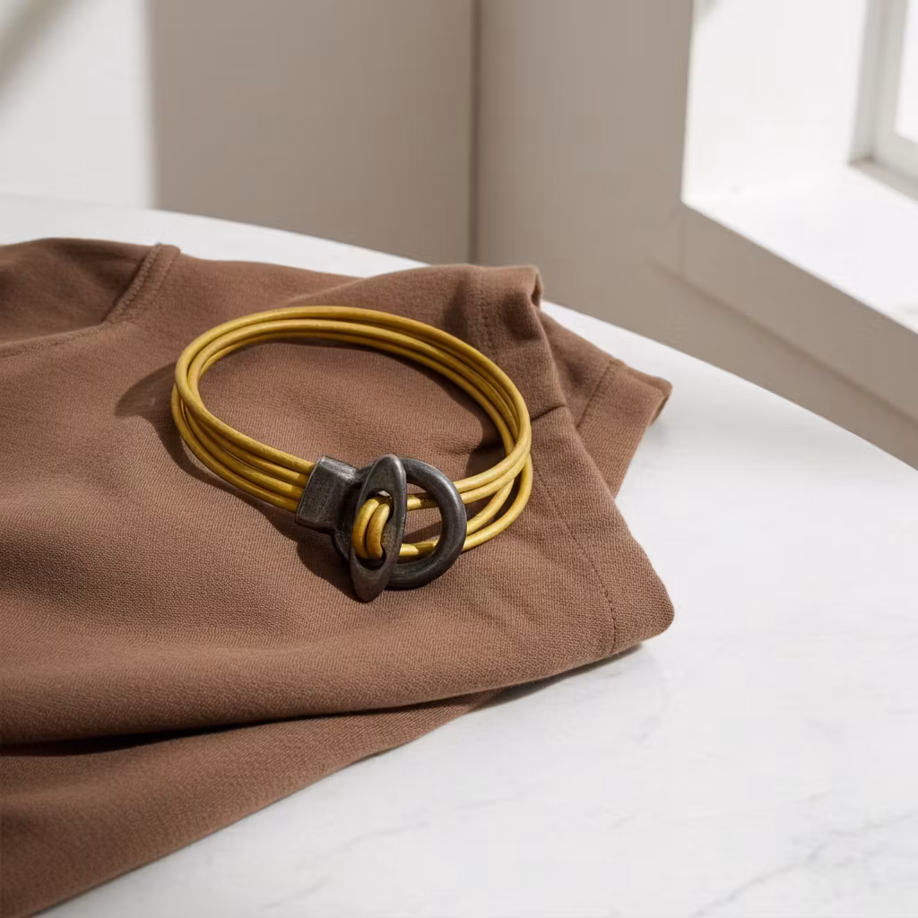 Senapsgult läderarmband i 4 rader med stort stilrent toggle lås pläterat i 999-finsilver. Det gula lädret är 2mm tjockt av äkta läder. Armbandet sitter bäst tight runt handleden.