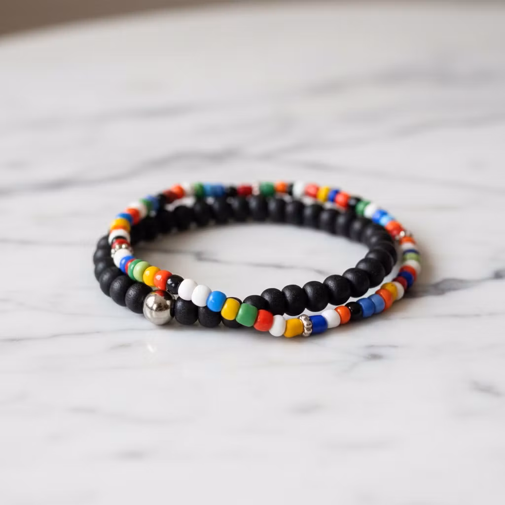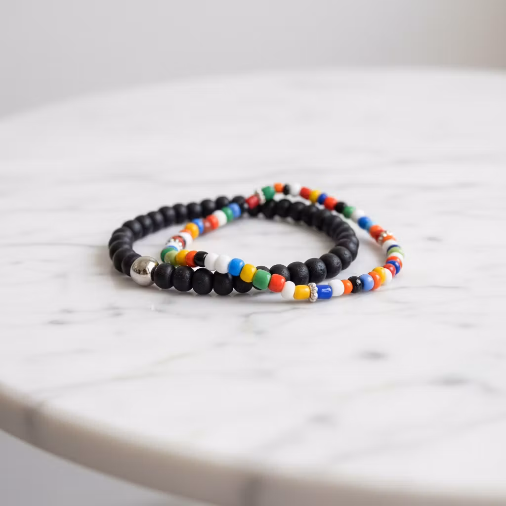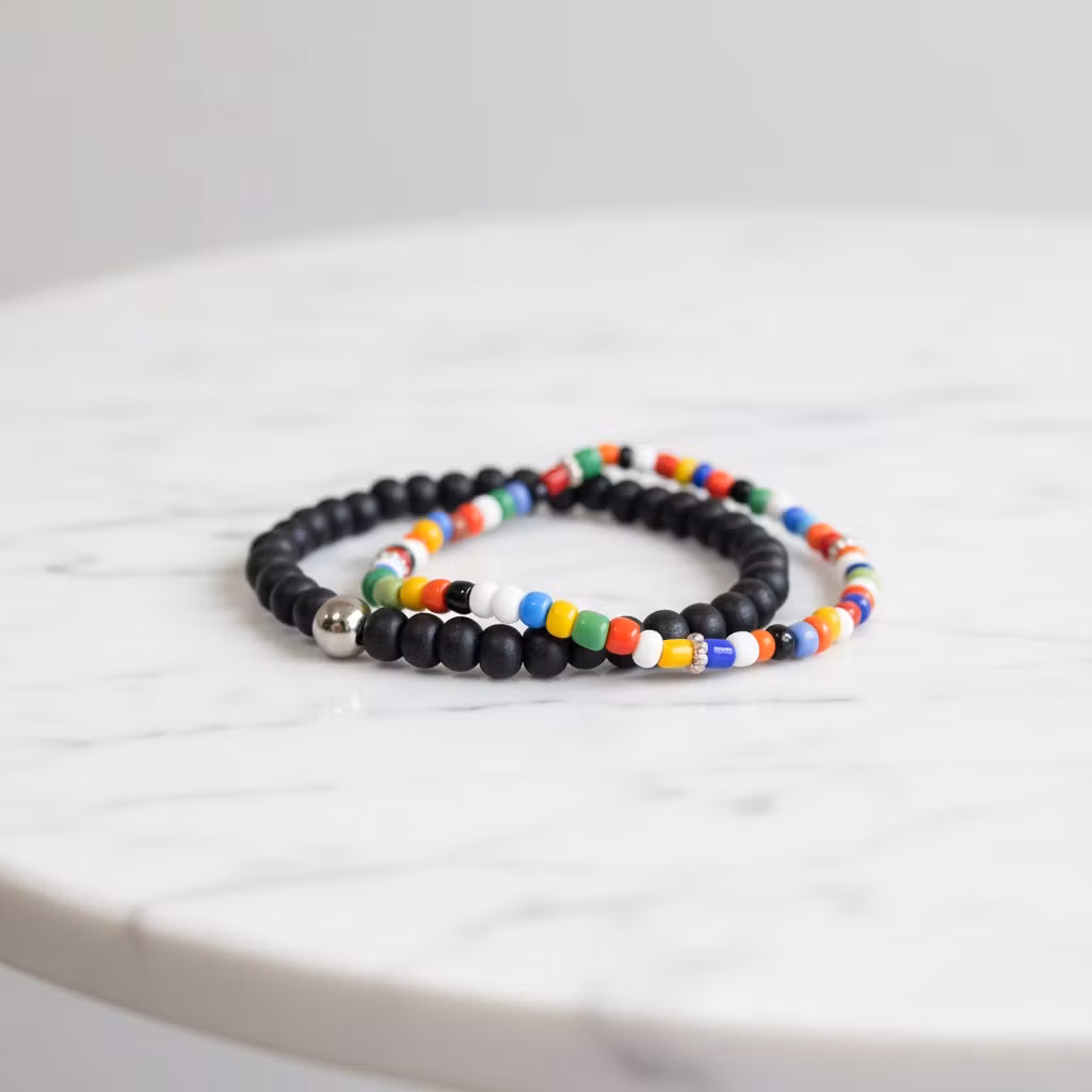 2-pack elastiska killarmband med pärlor i olika material. Ett svart träarmband och ett smalt färgglatt seed beads armband med mixade färger. Armbanden har stilrena silverpläterade detaljer. Bär armbanden tillsammans eller var för sig.