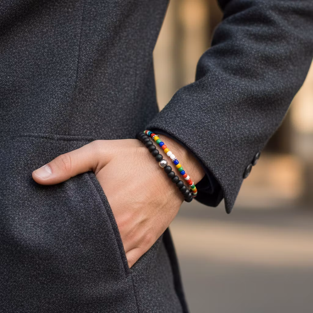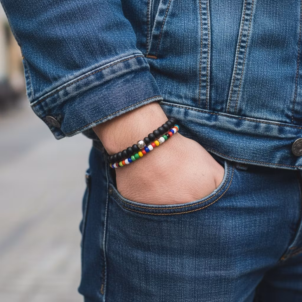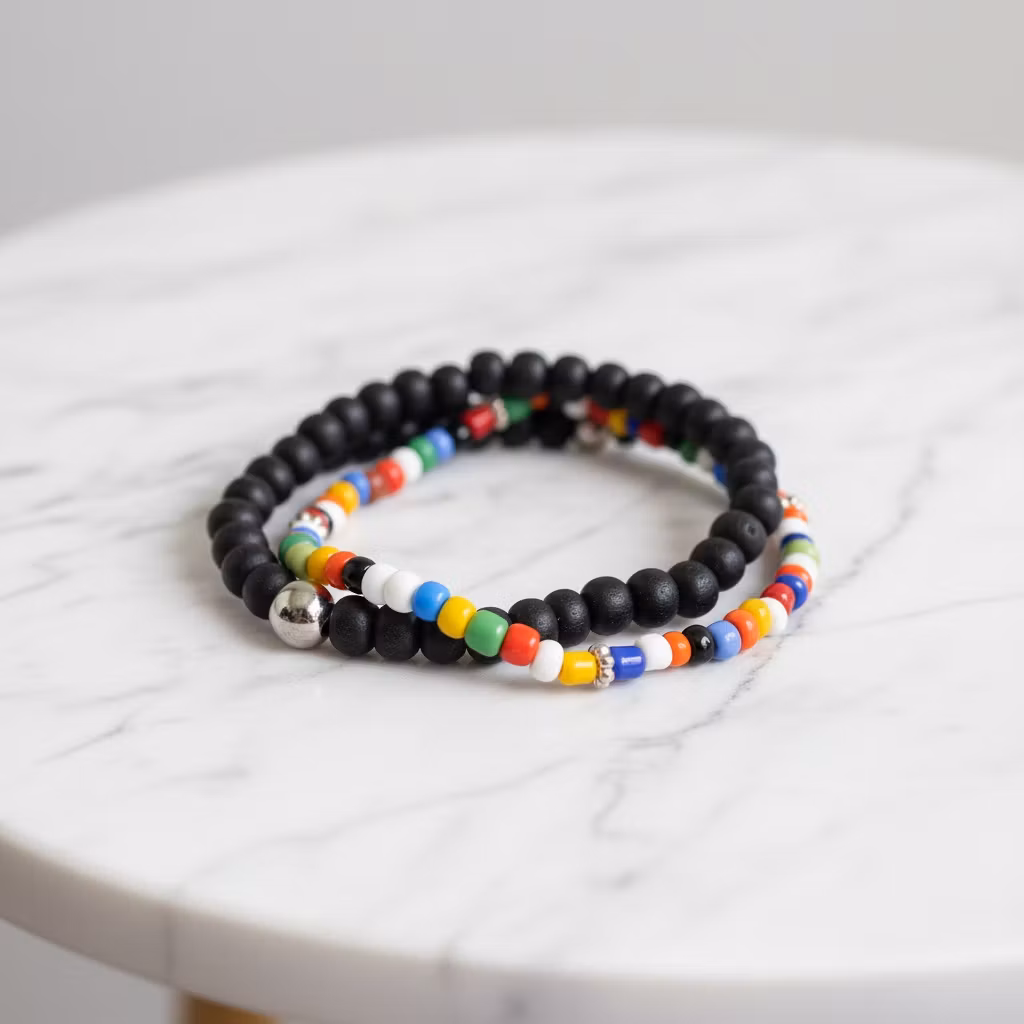 2-pack elastiska killarmband med pärlor i olika material. Ett svart träarmband och ett smalt färgglatt seed beads armband med mixade färger. Armbanden har stilrena silverpläterade detaljer. Bär armbanden tillsammans eller var för sig.