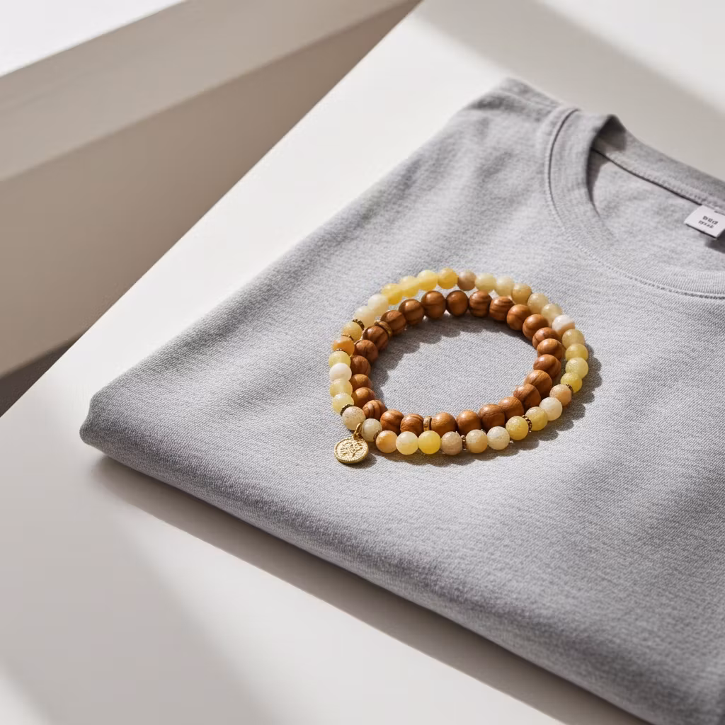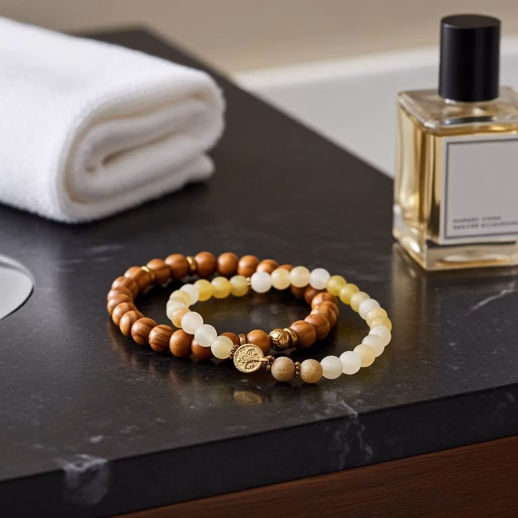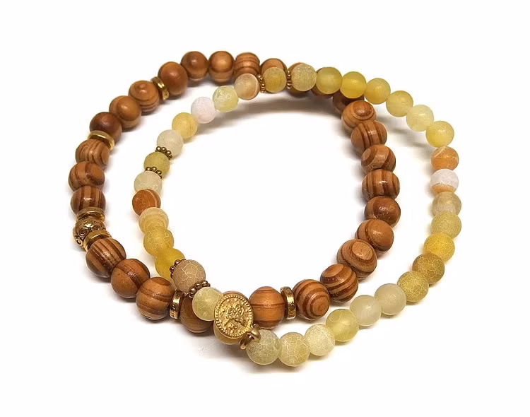 2 stycken pärlarmband för män med bruna mönstrade träpärlor och gula matta agat stenar. Ett snyggt och matchande armband set i brunt, gult och guldfärg med guldpläterade detaljer och berlock. Armbanden är elastiska.