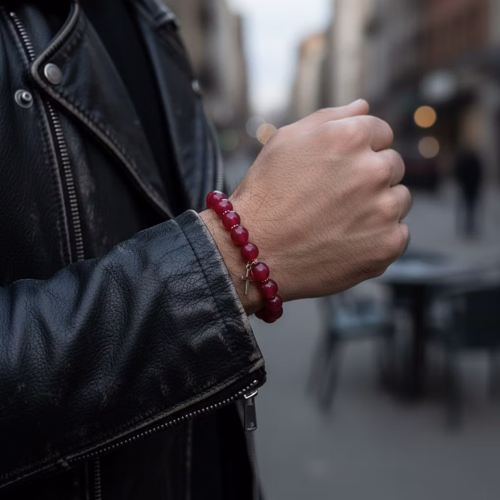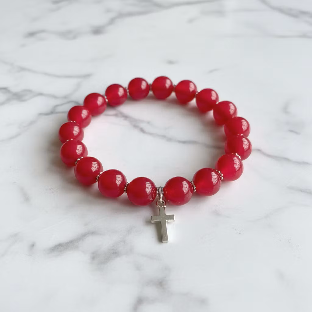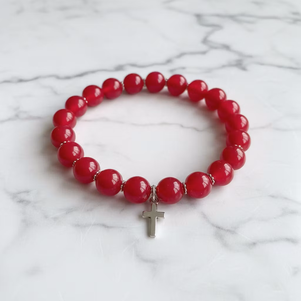 Rött elastiskt jade armband med kors berlock. Det röda jade armbandet har 10mm stora klarröda släta stenar och silverpläterade stilrena detaljer. Färgstarkt jade armband med kors för herrar.