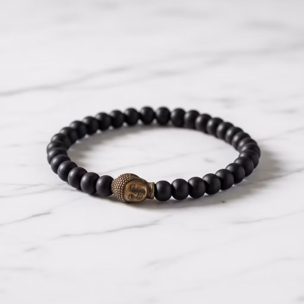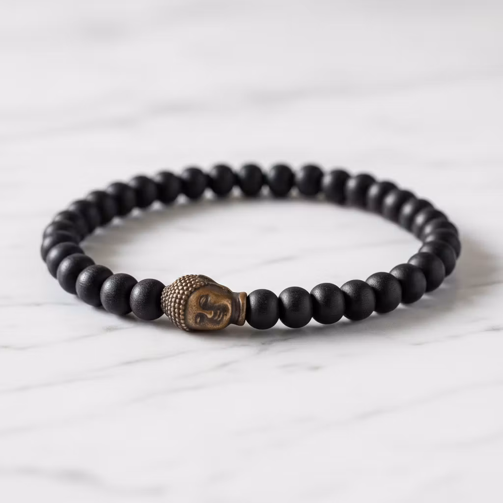 Svart elastiskt Buddha armband med svarta träkulor och Buddha huvud i koppar. Stilrent svart träarmband med fina koppar detaljer. Fint varje-dag-armband.