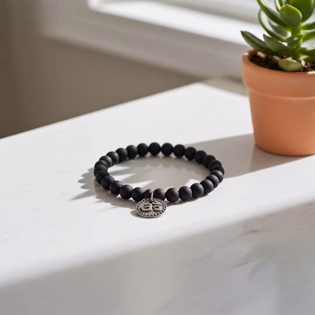 Svart elastiskt pärlarmband med rund Aum berlock och 8mm stora svarta matta gummipärlor. Aum, eller "OM" är den heligaste av alla skrifter inom hinduismen. Det svarta armbandet ger ett stilrent intryck.