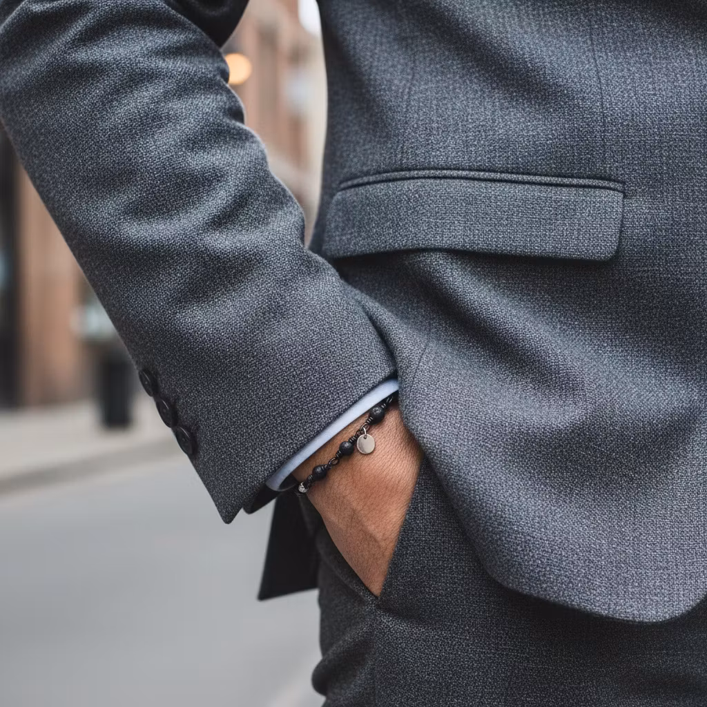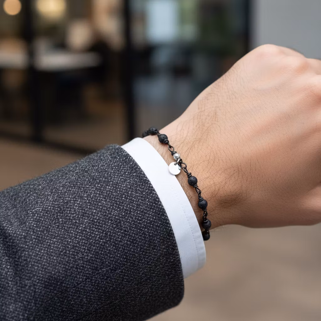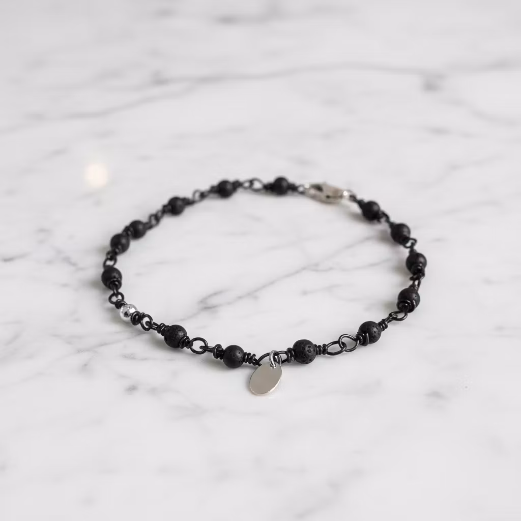 Svart smalt herrarmband i äkta silver med 4mm små svarta matta stenar och liten oval silver berlock med 925 stämpel. Armbandet stängs med klolås. Det svarta armbandet har berlock, fasettslipad silverkula och lås i äkta sterling silver. Stenarna är länkade med svart nickelfri metalltråd.