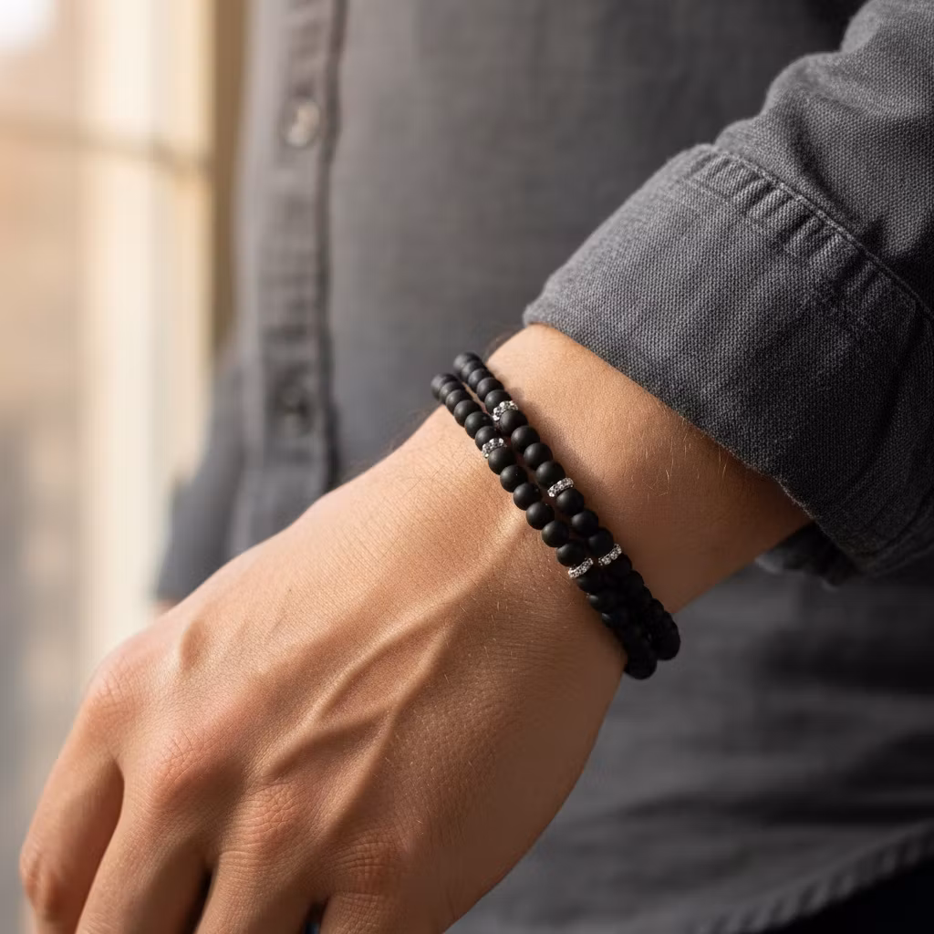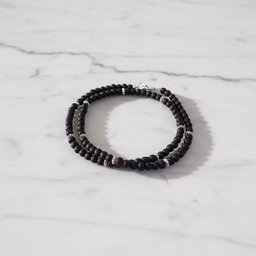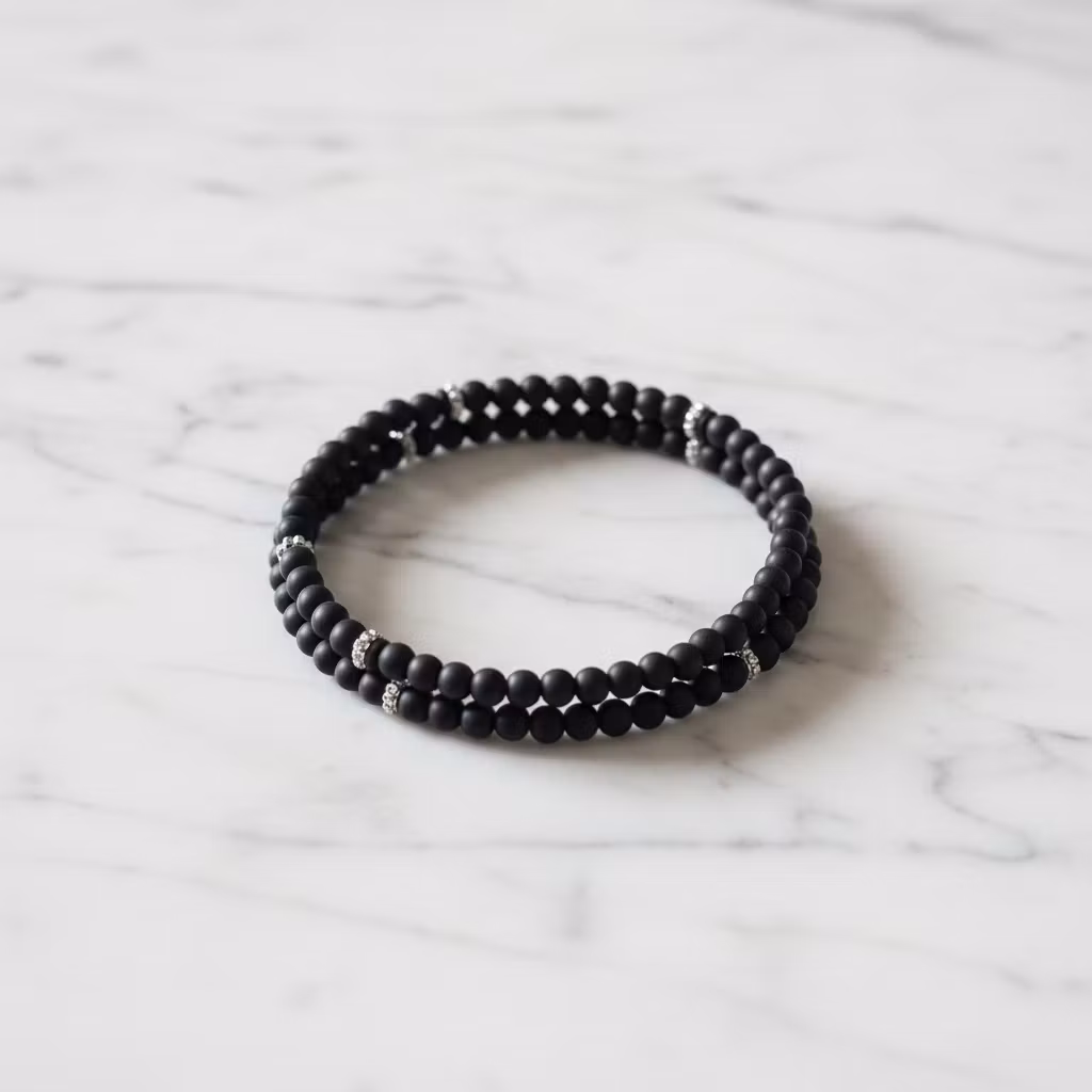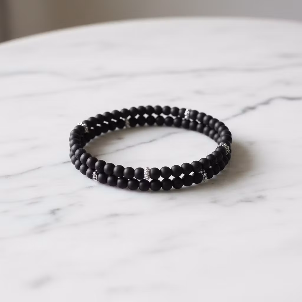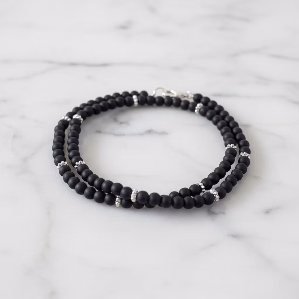 2 rader svart sten armband med 4mm små svarta matta stenpärlor. Armbandet viras två varv runt handleden och stängs med lås. Smalt stenarmband med matta stenar och stilrena manliga detaljer.
