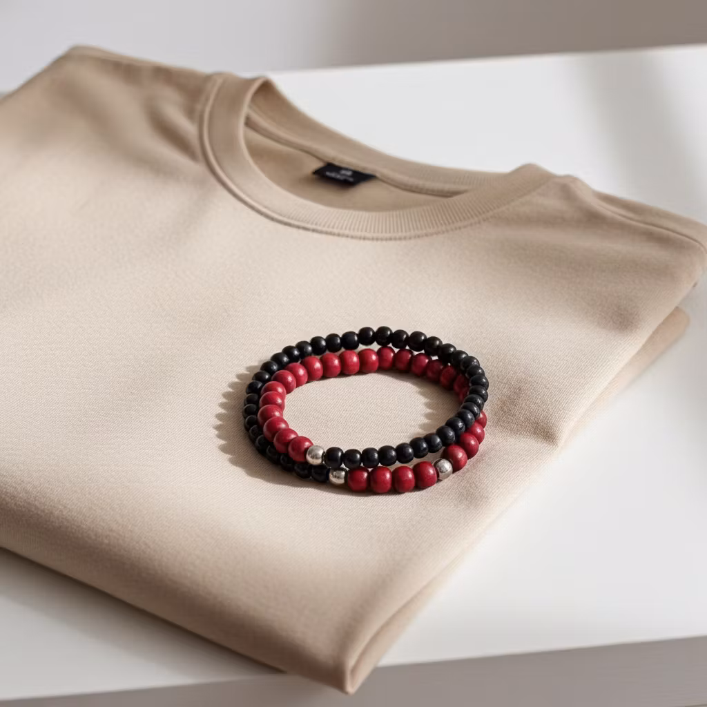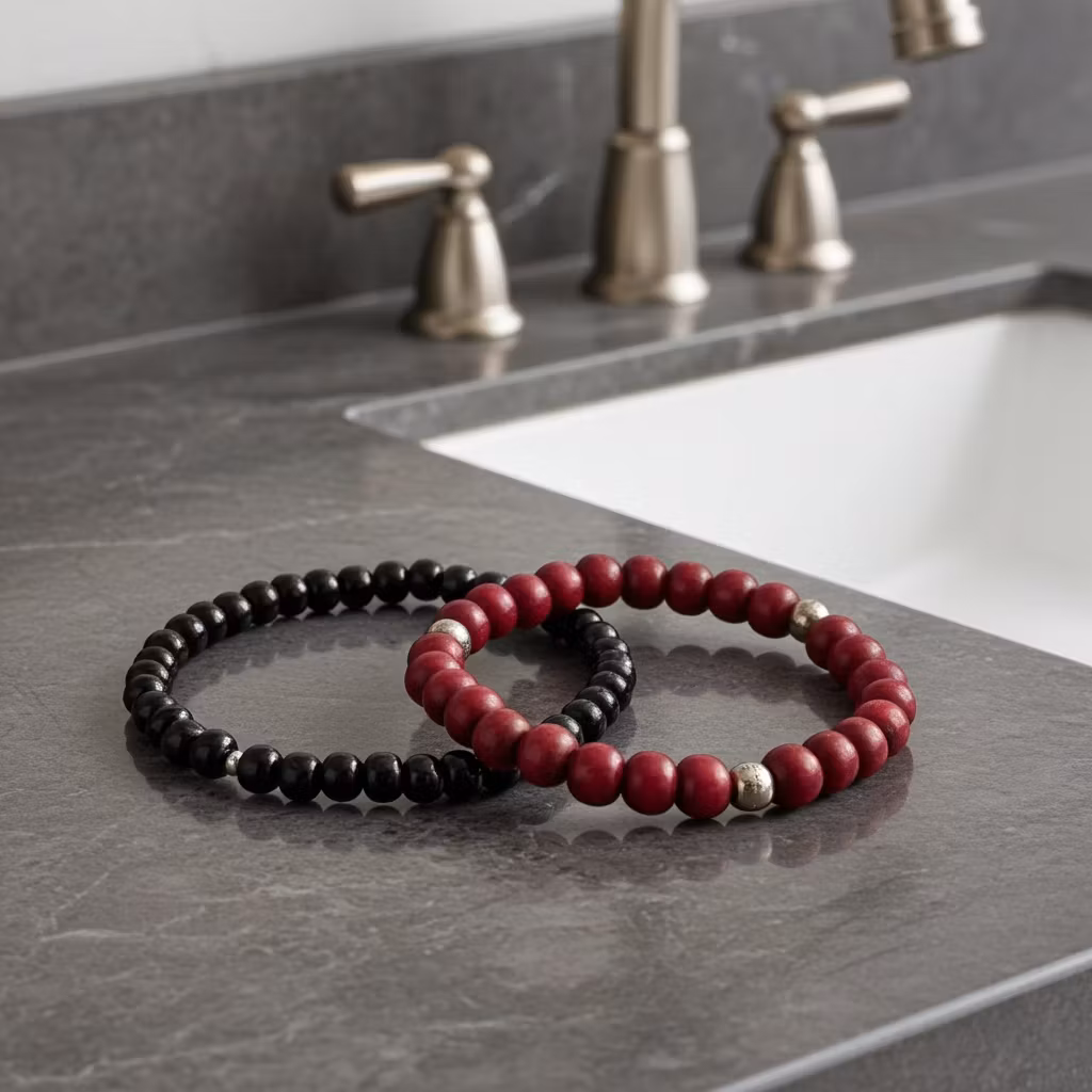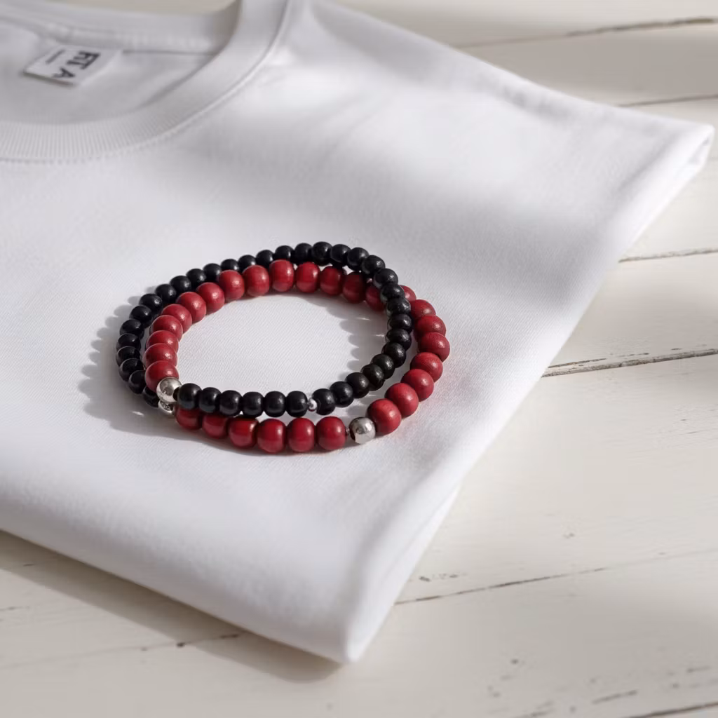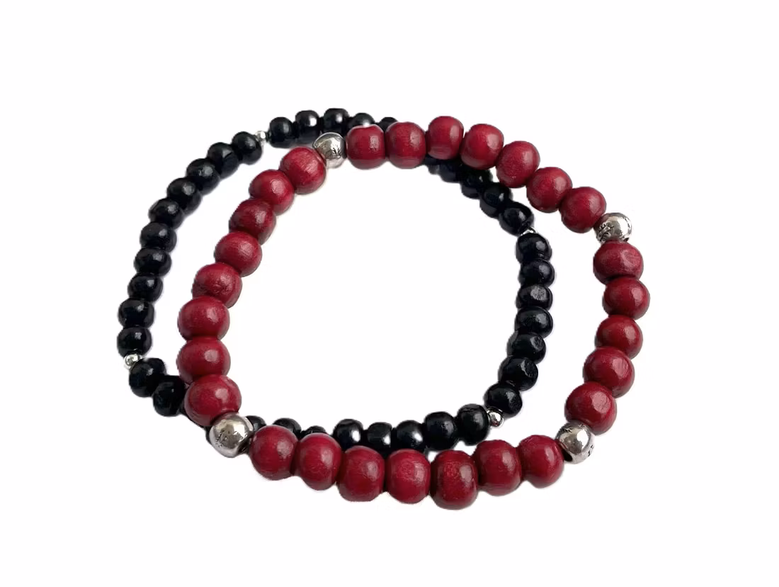 Elastiska träarmband i snyggt set för herr med två stycken armband av träkulor. Ett rött träarmband och ett matchande svart smalare armband i trä. Stilrena trä armband med silverpläterade detaljer. 2-pack med armband.