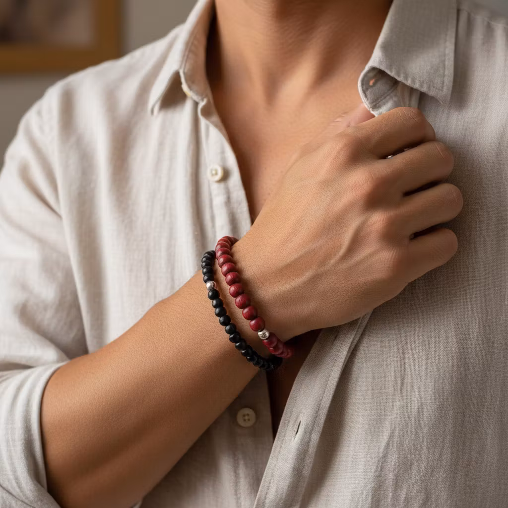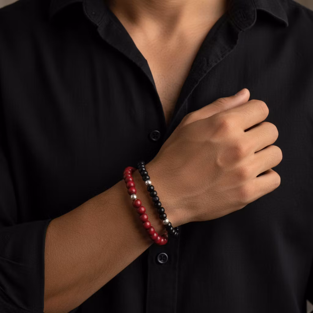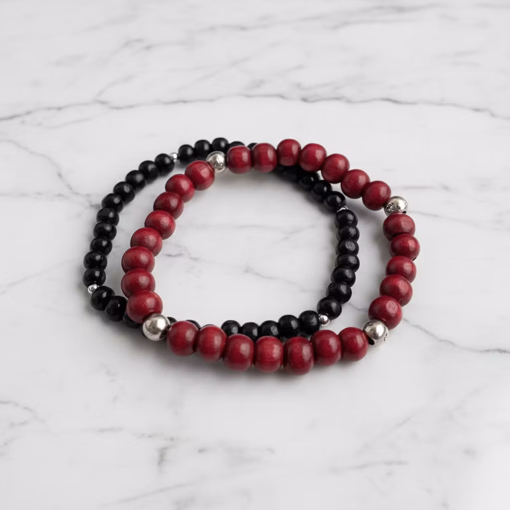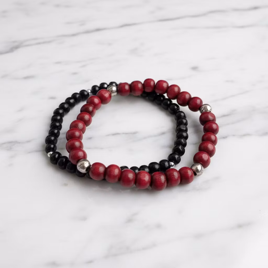 Elastiska träarmband i svart, rött och silver för herr med två stycken armband av träkulor. Setet innehåller ett rött träarmband och ett matchande svart smalt armband i trä. Stilrena trä armband med silverpläterade detaljer. 2-pack med mixade armband.