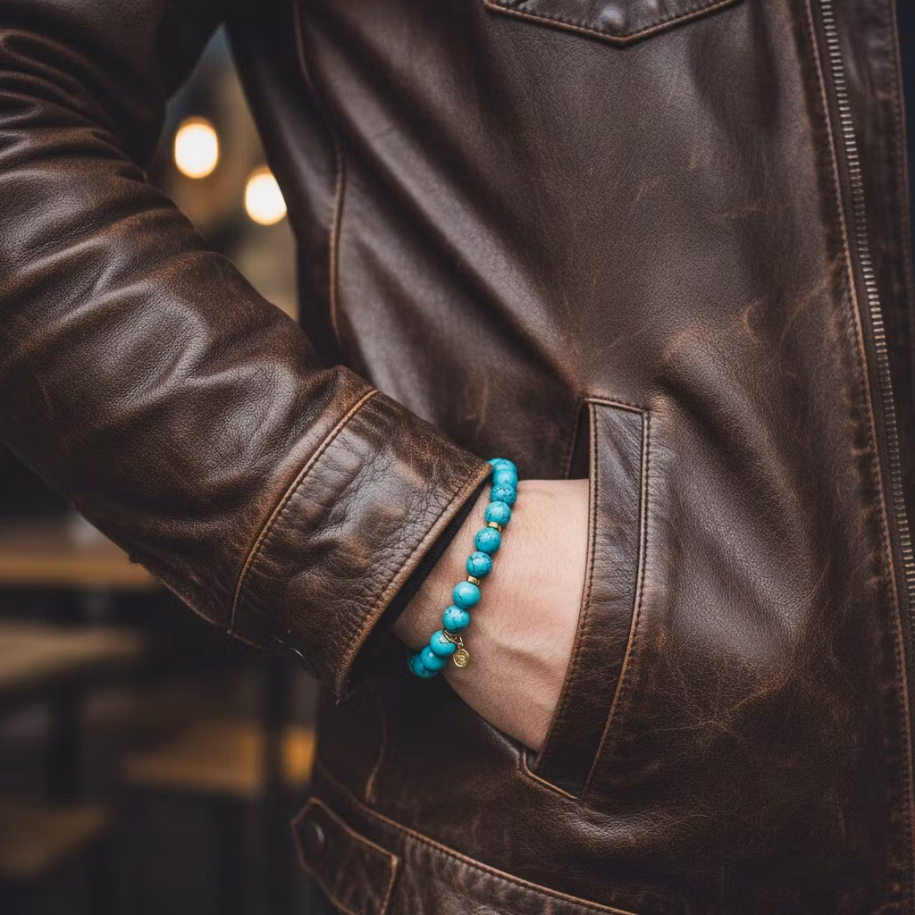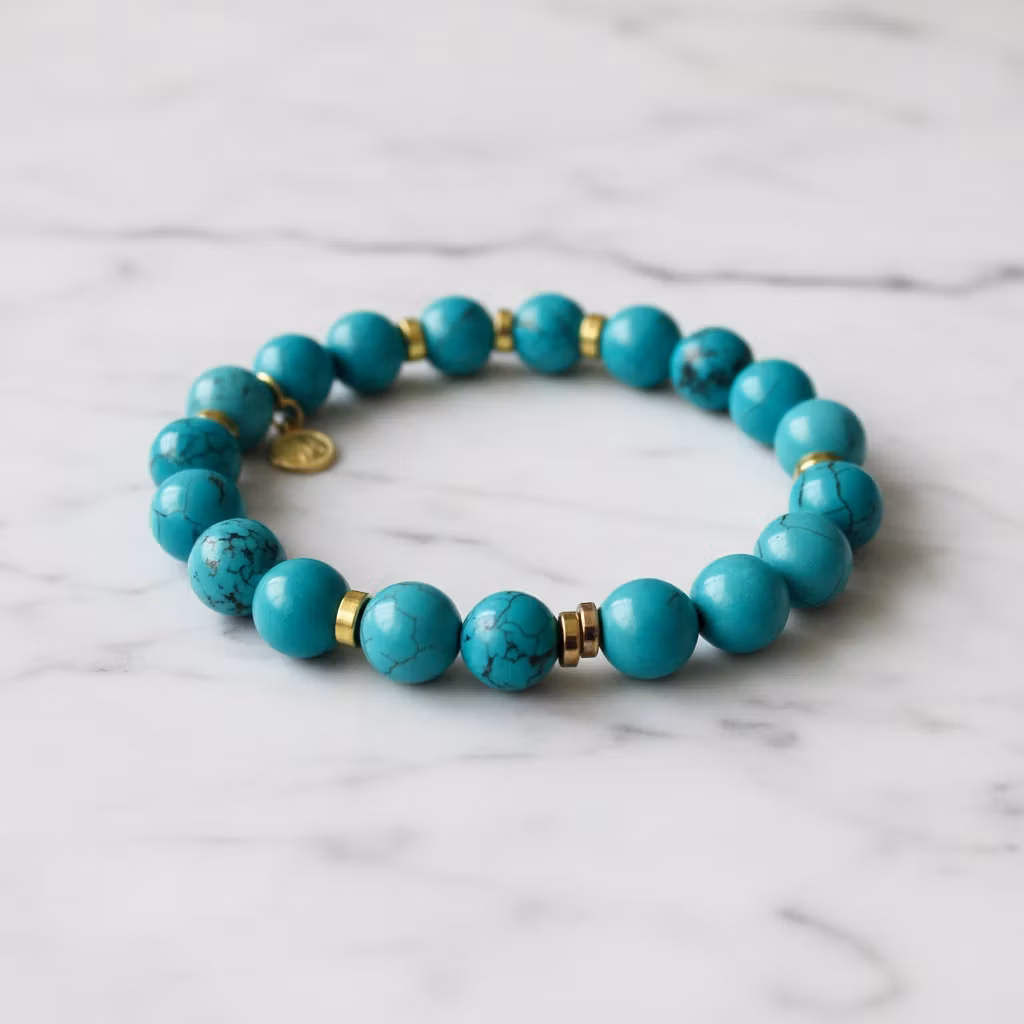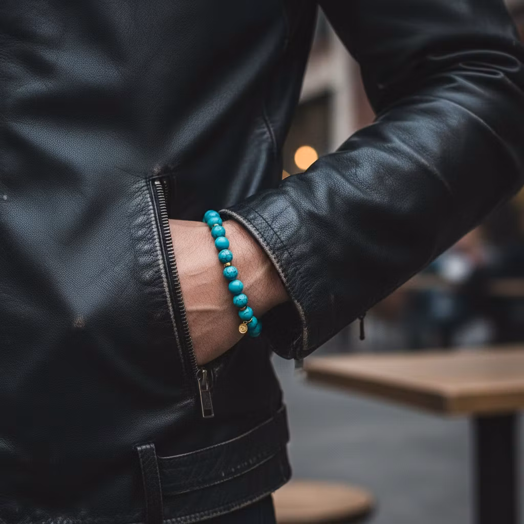 Elastiskt turkos armband med guldpläterade stilrena detaljer och liten berlock. Turkoserna är 10,5mm stora med fina ådror. Elegant turkosarmband för män, perfekt för alla tillfällen.