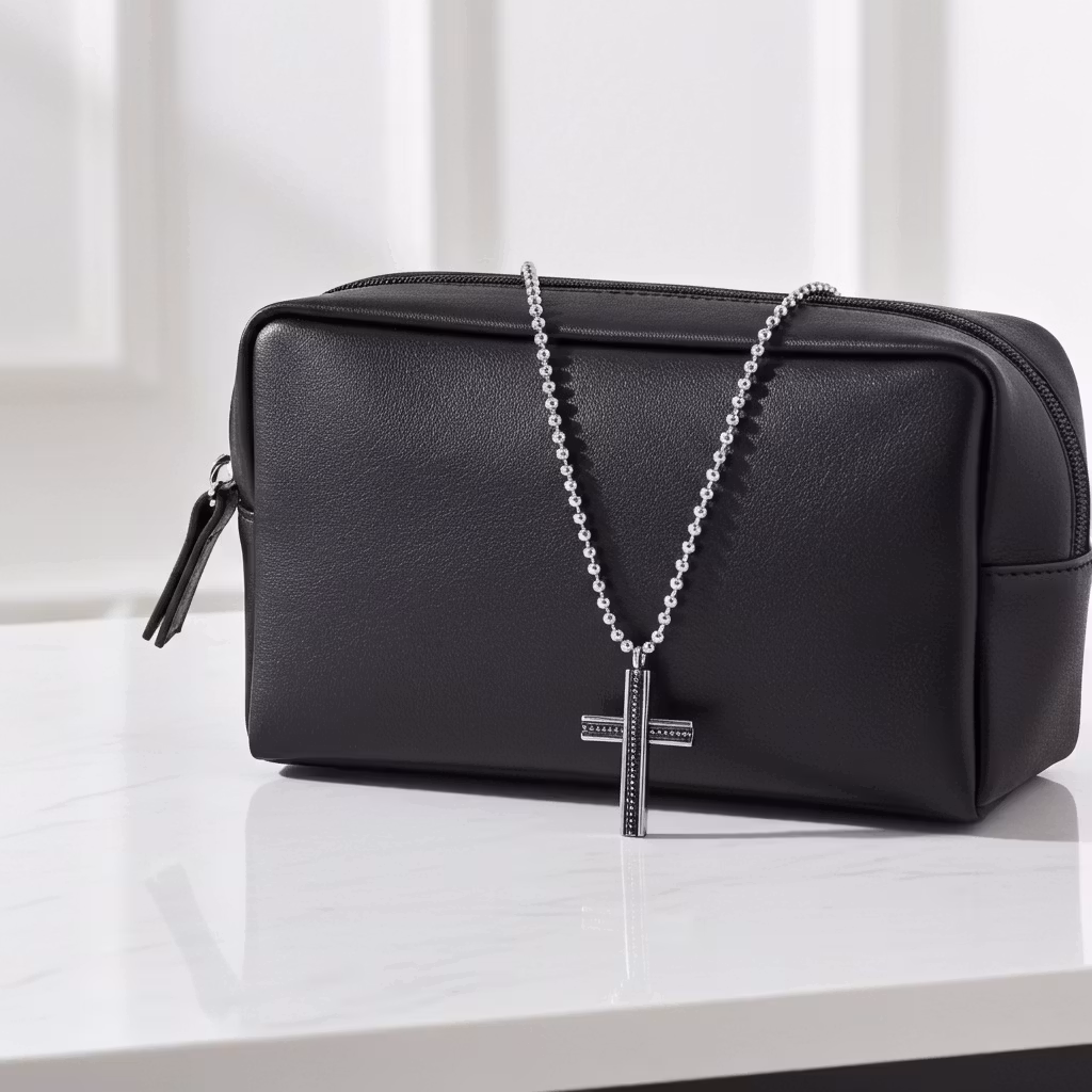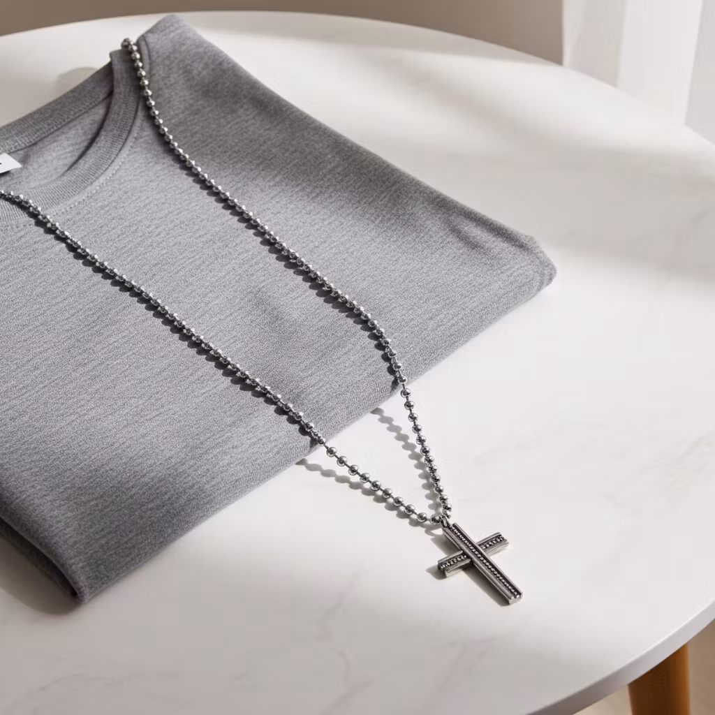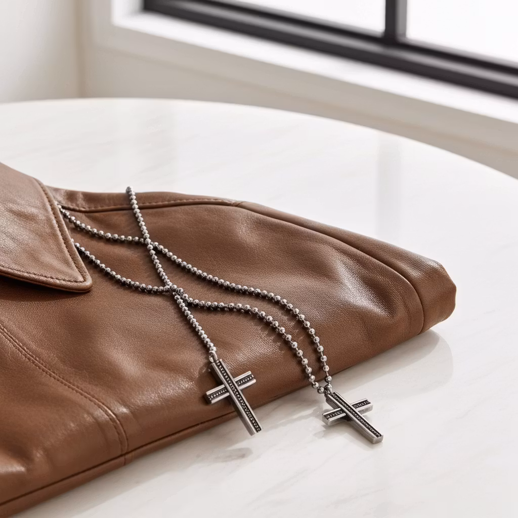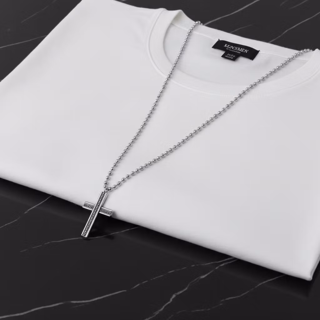 Kors halsband i äkta silver med kulkedja och stort handgjort unikt kors. Halsbandet har en 2,3mm tjock silverkedja och ett ca 4,5cm långt kors med stilrena detaljer. Korset har en lätt oxiderad yta i antik silver finish. Stilfullt och unikt korshalsband för män skapat från sterling silver. Silverhalsband med kors hänge. Polerduk medföljer.