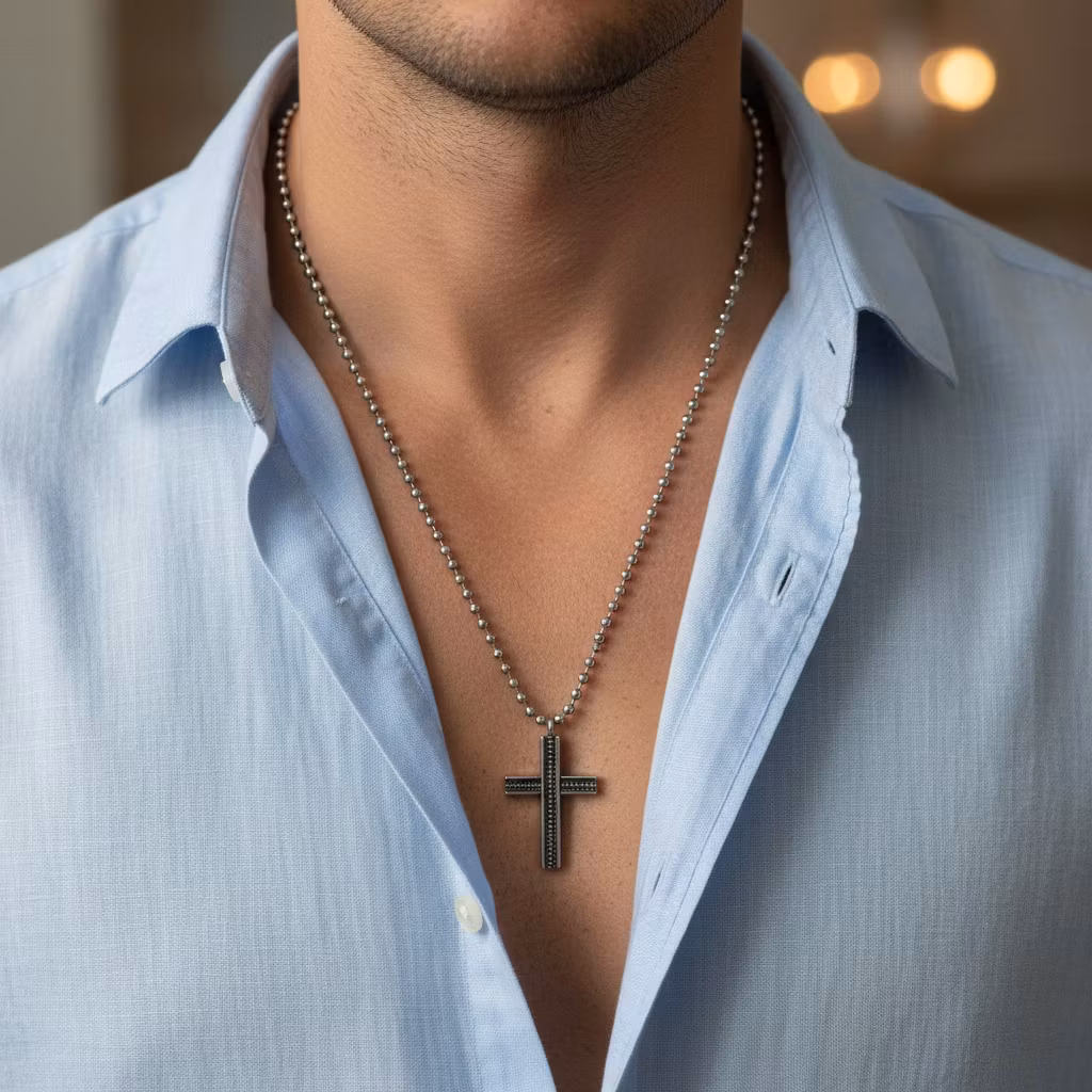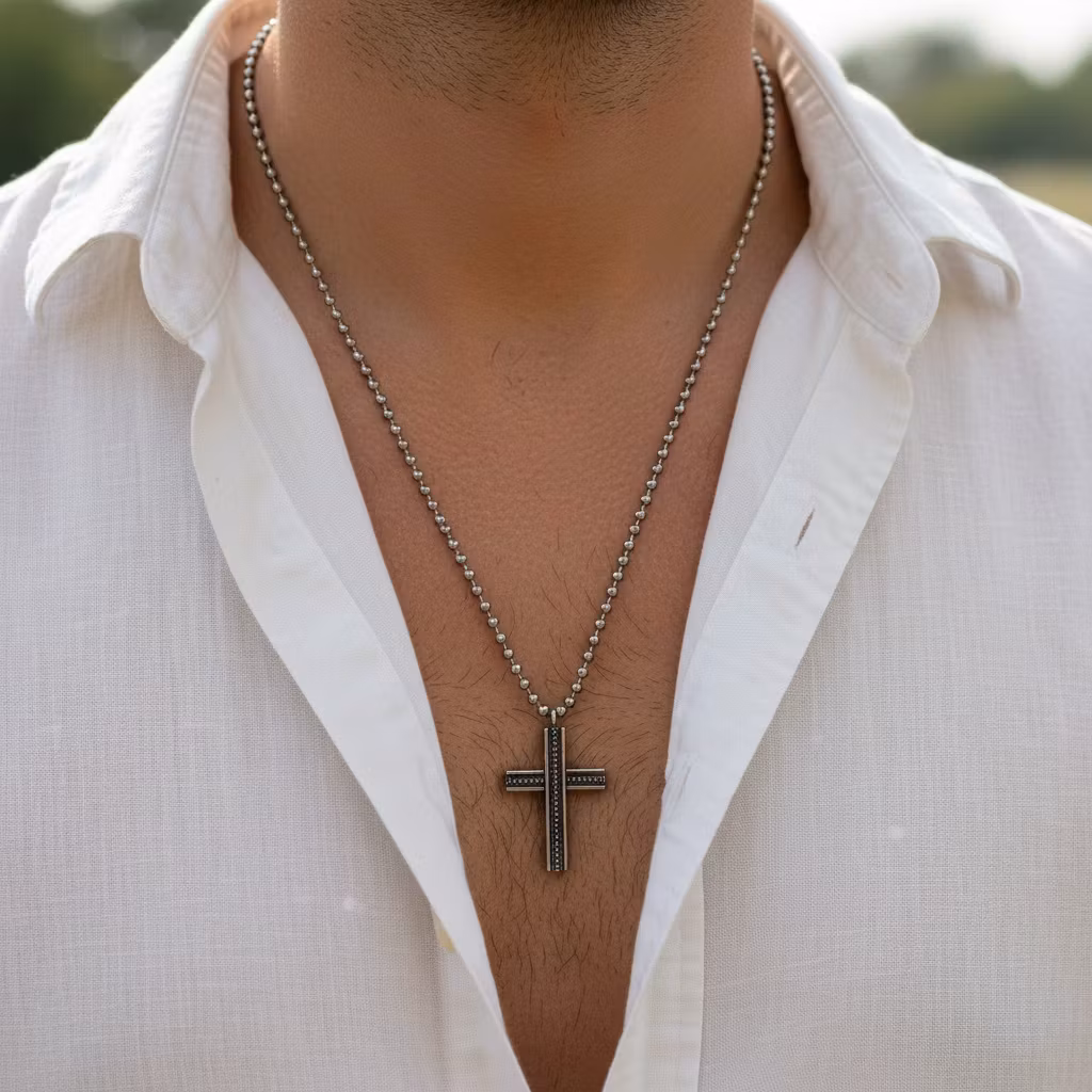 Kors halsband i äkta silver med kulkedja och stort handgjort kors. Halsbandet har en 2,3mm tjock silverkedja och ett ca 4,5cm långt kors med stilrena detaljer. Korset har en lätt oxiderad yta i antik silver finish. Stilfullt och unikt korshalsband för män skapat från sterling silver. Polerduk medföljer.