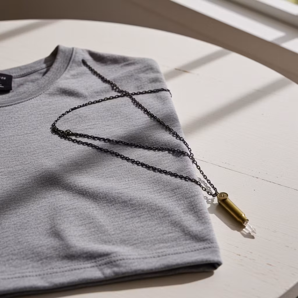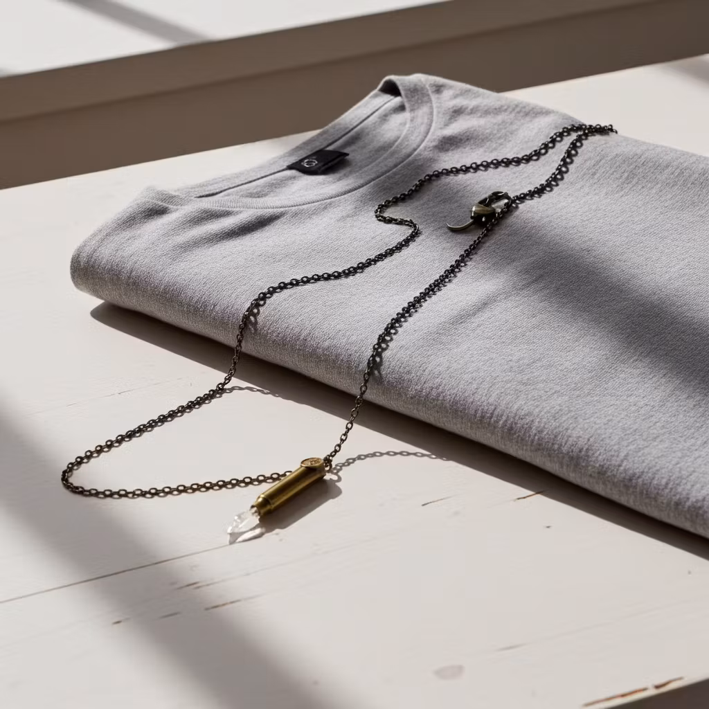 Patron halsband med rå klar kristall och Magnum Remington patronhylsa i brons. Halsbandet har en matchande smal kedja av brons. Trendigt halsband med patronhylsa, berlock och kedja i rustik brons. Halsband i kaxig stil.