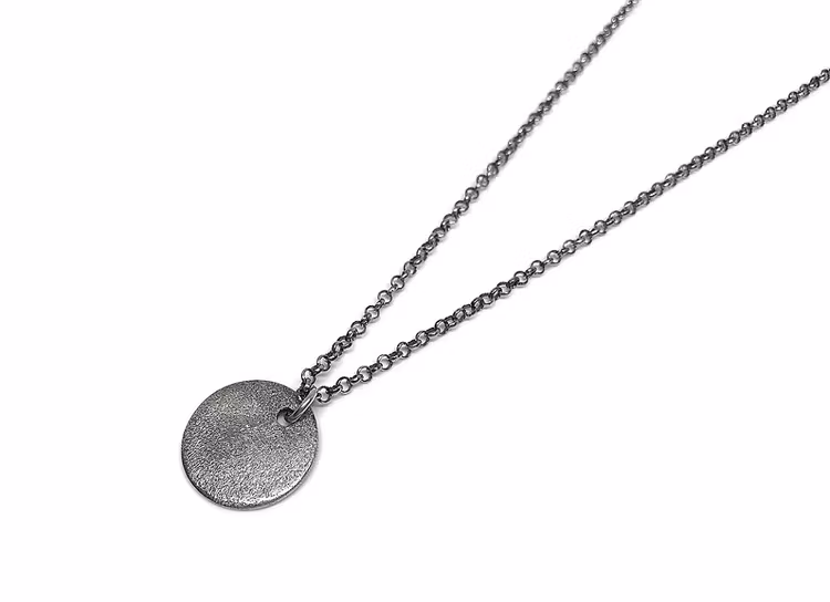 Oxiderat silverhalsband i äkta silver med rund mönstrad bricka och smal ärtlänkskedja. Halsbandet är oxiderad för en antik silver, patina look. Brickan är 15mm i diameter. Halsbandet har en matt silveryta. Trendigt herr halsband för tuffa stilar.