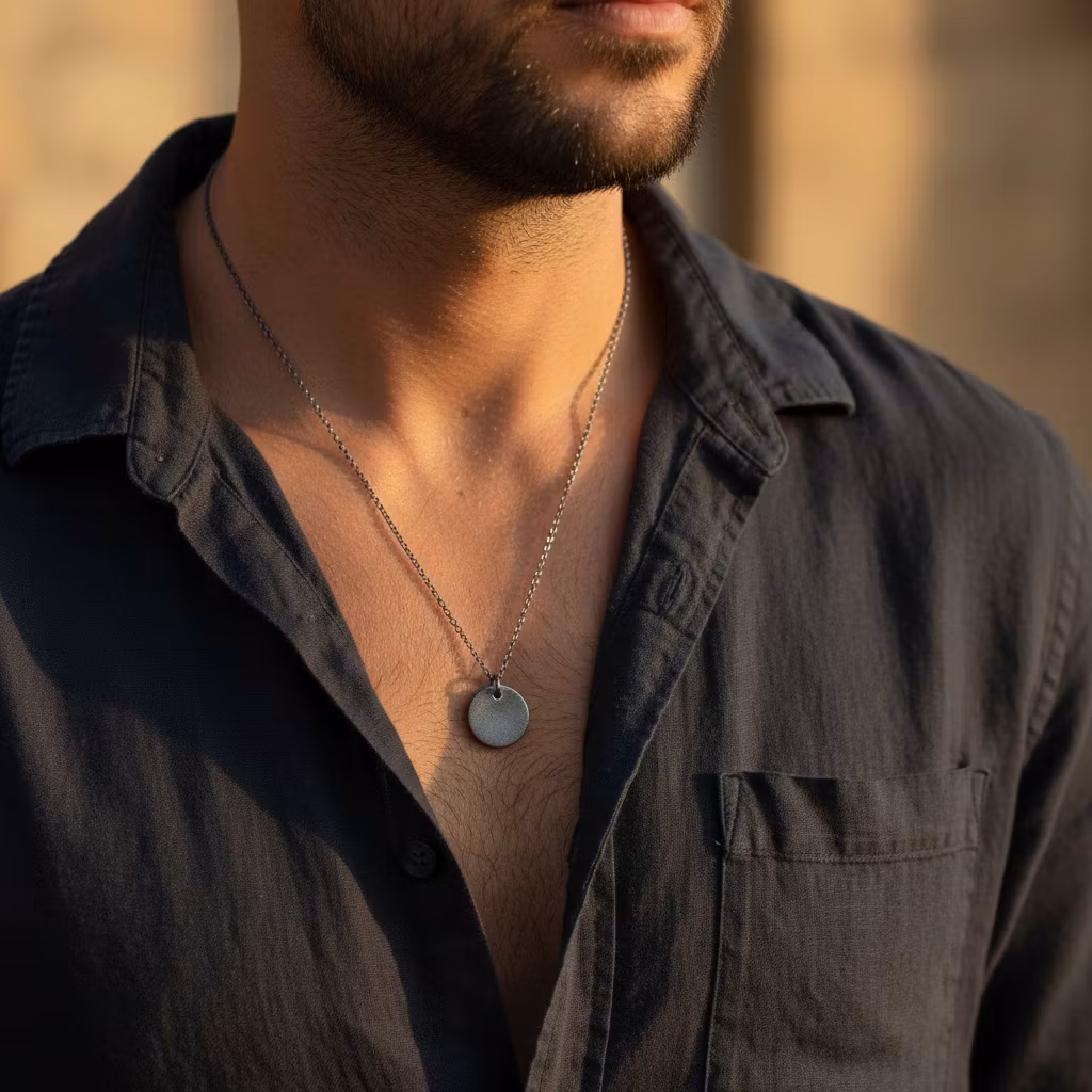 Oxiderat silverhalsband i äkta silver med rund mönstrad bricka och smal ärtlänkskedja. Halsbandet är oxiderad för en antik silver, patina look. Brickan är 15mm i diameter. Halsbandet har en matt silveryta. Trendigt herrhalsband för kaxiga stilar.