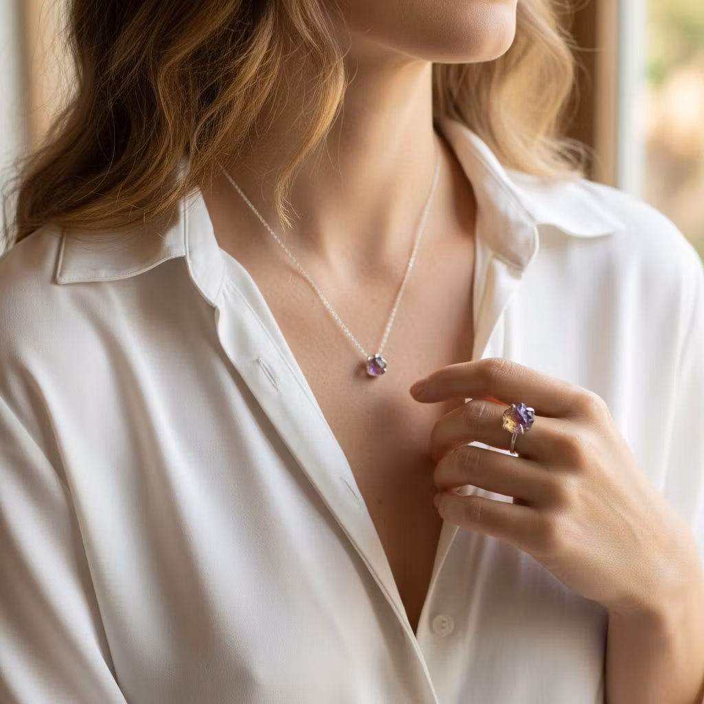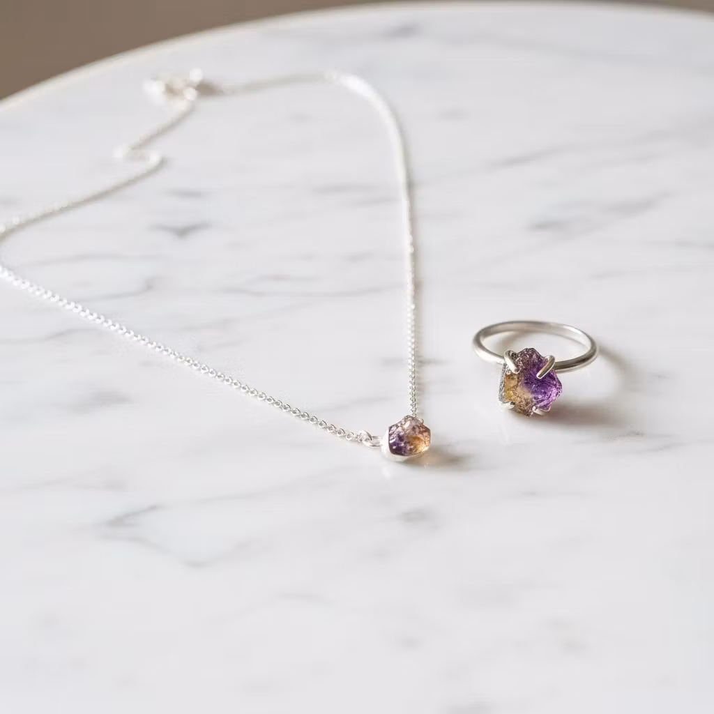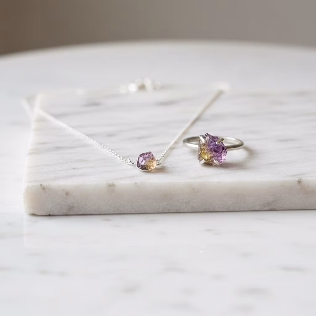 Smyckeset rå ametrin med matchande halsband och ring med grova ametrin kristaller i fantastiskt fin glänsande kvalitet. Kristallerna är i måttet 8mm - 10mm. Smyckena är tillverkade i äkta silver med naturlig kristall. Ametrin är en blandning av ametist och citrin, kristallen innehåller färgerna gult och lila. Halsbandet är 45cm långt. Vackra kristallsmycken med råa ametiner, perfekt för kristallälskaren. Polerduk medföljer.