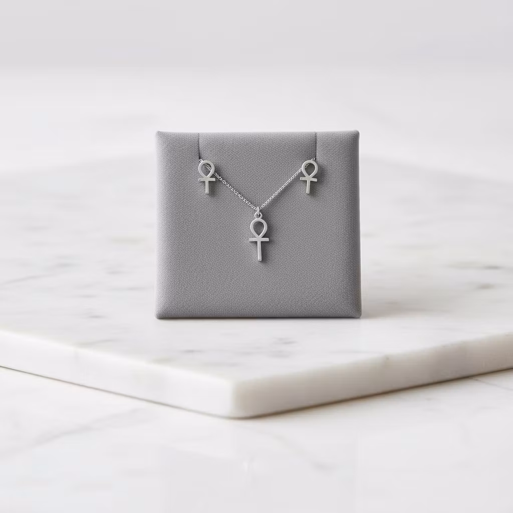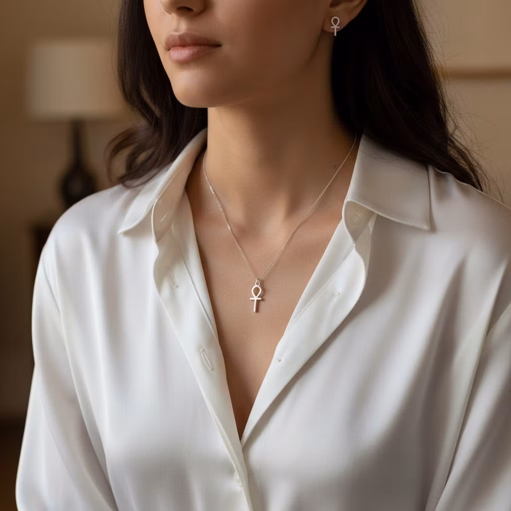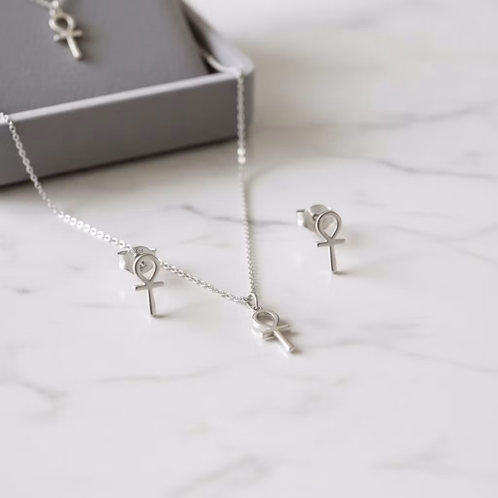 Silversmycken i matchande set med Ankh kors symbol. Setet innehåller studsörhängen och halsband med Ankh kors i blankt silver. Halsbandet har en smal halskedja med ca 25mm långt Ankh hänge. Örhängena är ca 10mm långa. Smyckena är skapade från återvunnet sterling silver. Det är tidlösa setet med Ankhkors är perfekt för stilrena och klassiska stilar. Polerduk medföljer.