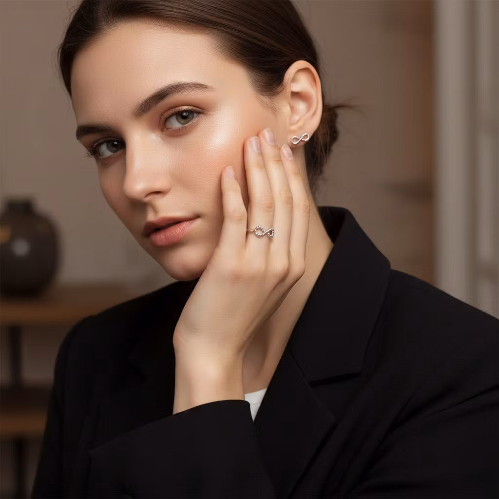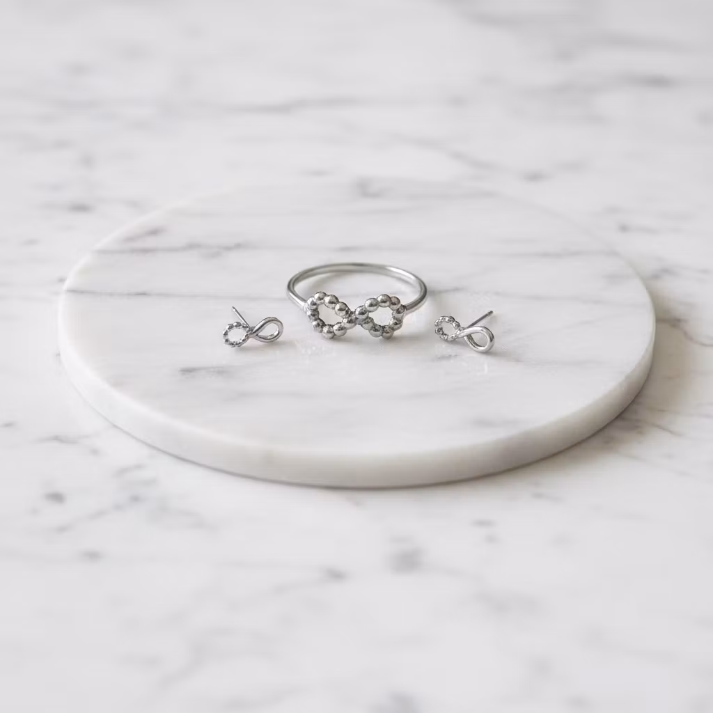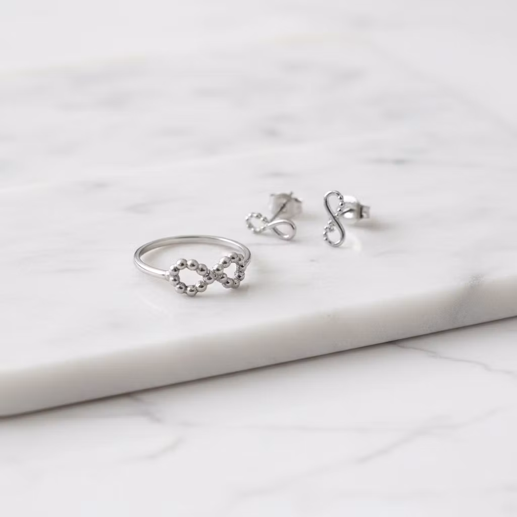 Stilrent och elegant smyckeset i äkta silver med matchande örhängen och ring med evighetstecknet. Silversmyckena är skapade av sterling silver med evighetssymboler gjorda av små kulor. Örhängena är ca 14mm långa och levereras med bakstycken. Ringen har en slät yta med smalt ringband. Evighetstecknet är ca 14mm långt. Det här stilfulla setet med matchande smycken är en perfekt gåva till den du håller kär, eller åt dig själv. Polerduk medföljer.